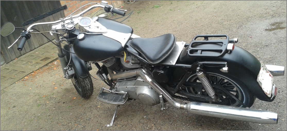 D.h. Es ist ein FXR Rahmen mit der FLT Technik (Motor, Getriebe, Schwinge). Front ist FLH mit Ochsenkopf.