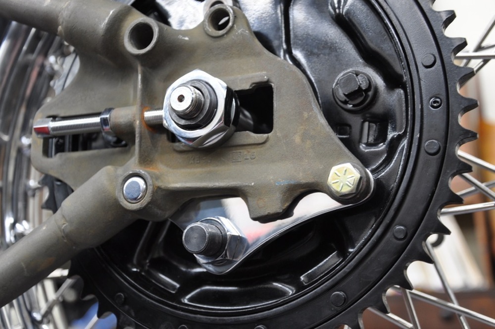 ich gehe davon aus, dass du für diesen umbau etwas am rahmen ändern musst: an den hinteren ausfallenden sitzt beim starrrahmen rechts und links ein Gussstück. während die rechte seite nur über einen "schlitz" zur aufnahme der Radachse verfügt, befindet sich auf der linken seite vor diesem schlitz ein weiterer, der die bremsgrundplatte der originalen Trommelbremse gegen verdrehen sichert. ich schätze, diesen Bereich musst du bearbeiten (möglicherweise ganz entfernen und durch zwei eingeschweißte Dreiecke ersetzen, die künftig deine bremszange halten).
