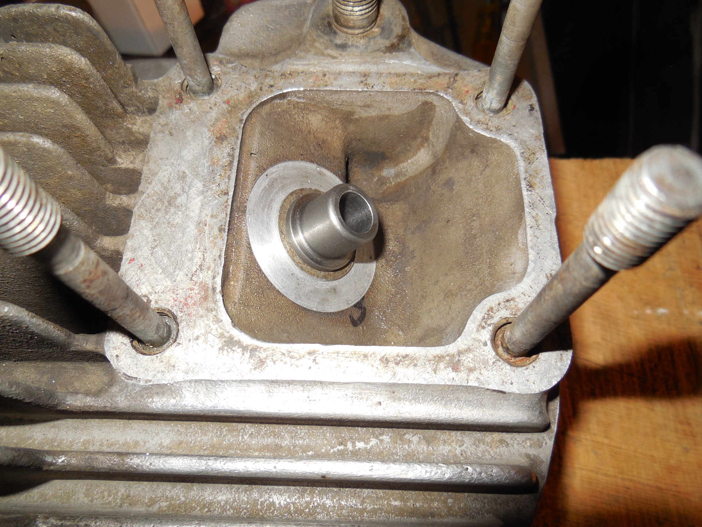 1. Anfräsen des Zylinderkopfes um die Ventilführung herum, um erstens etwas mehr "Luft" für die Ventilfedern zu bekommen und zweitens eine vollflächige und vor allem gerade Auflage für die Ventilfederteller zu schaffen. Mit einem Stirnfräser, der über die Führung winklig geführt wurde, war das kein Problem, und ich habe an der dünnsten Stelle noch knapp 2mm Material zum Einlaßkanal. So habe ich hier schon mal 2mm gewonnen.