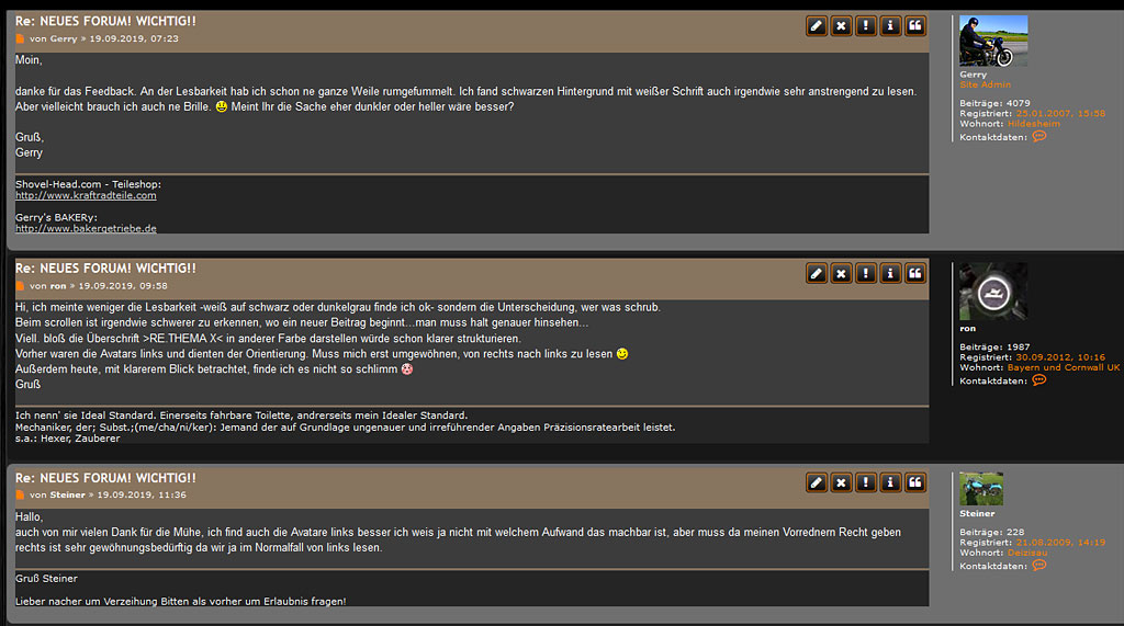 Hi Ron ...und die anderen.ron hat geschrieben: 19.09.2019, 10:58 Hi, ich meinte weniger die Lesbarkeit -weiß auf schwarz oder dunkelgrau finde ich ok- sondern die Unterscheidung, wer was schrub.