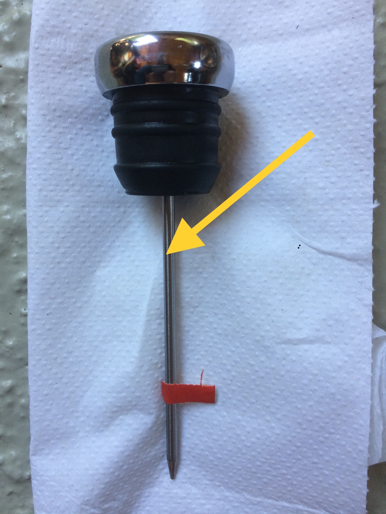Ich hatte in den vergangenen Jahren die Füllmenge mit den "4 quarts" nicht so auf dem Schirm und hatte den Öltank immer so befüllt, dass der Pegel so ca. 1 Zoll unter der oberen Tankkante steht (so auch der Hinweis im Manual als eine "Kontrollmarke" zusätzlich zur Mess-Stab-Markierung); nach 50 km Fahrt dann nochmals kontrolliert und gegebenenfalls geringfügig nachgefüllt. Mein Messtab mit Thermometer (aus dem Zubehörhandel) gibt nichts her, da die Messmarke (rotes Fähnchen unten auf dem Foto) viel zu tief läge und der tatsächliche Ölstand sich etwa beim gelben Pfeil befindet.