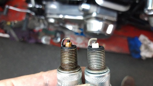 Die rechte Kerze sieht gut aus, die linke war/ist abgesoffen, sieht auch ölig aus - bist Du sicher ob die noch funkt, das Moped auf 2 Zyl. läuft?