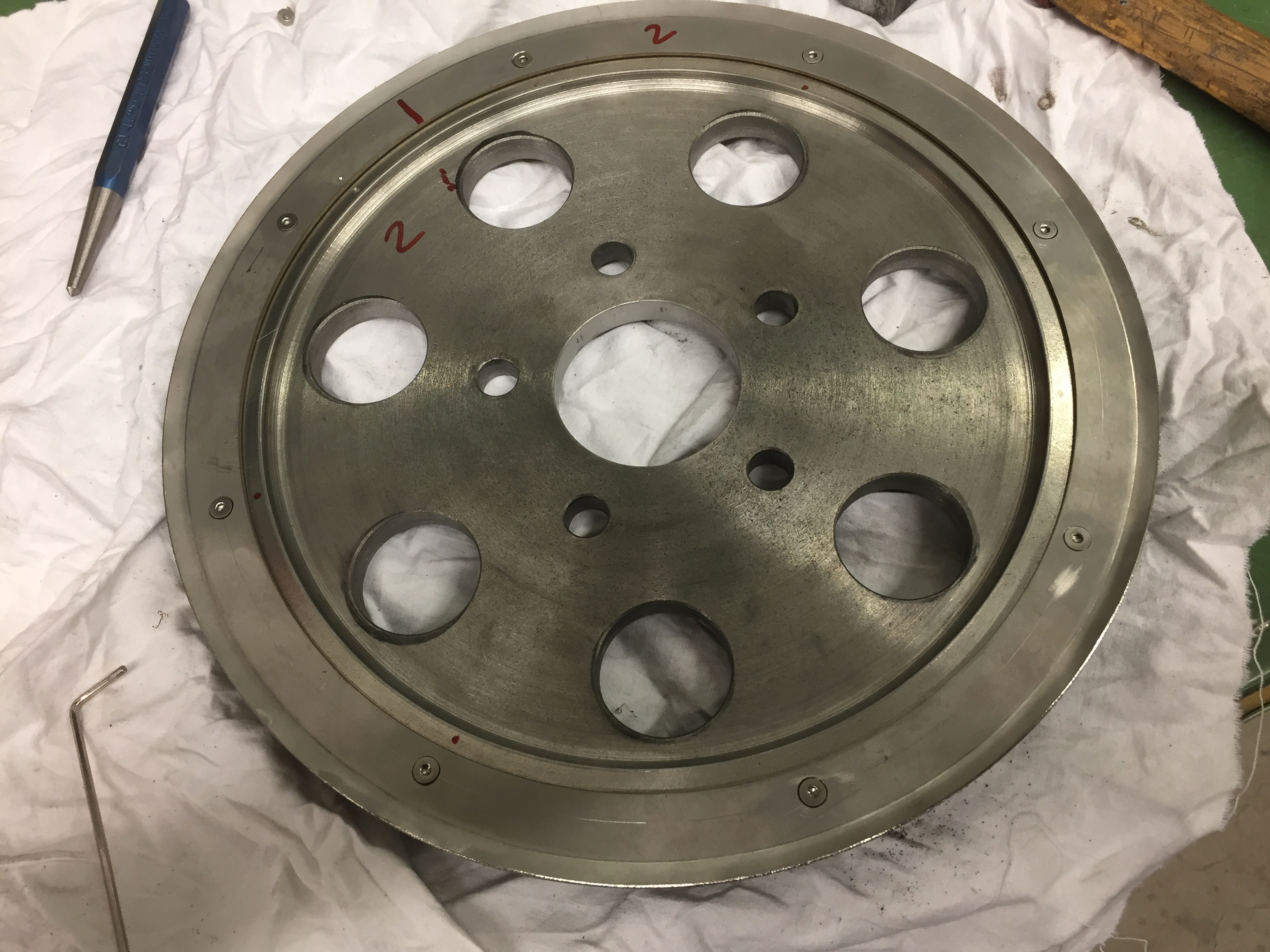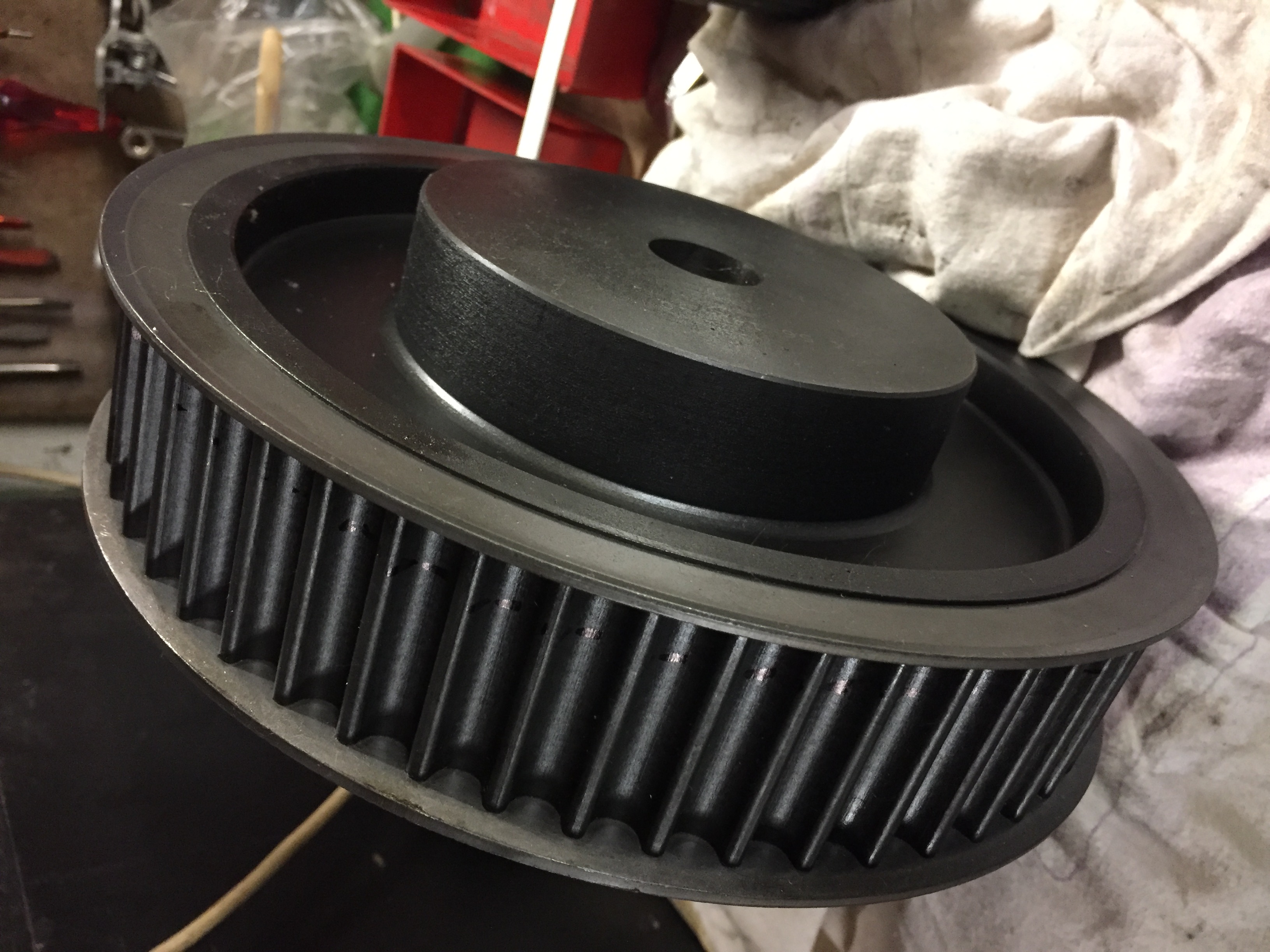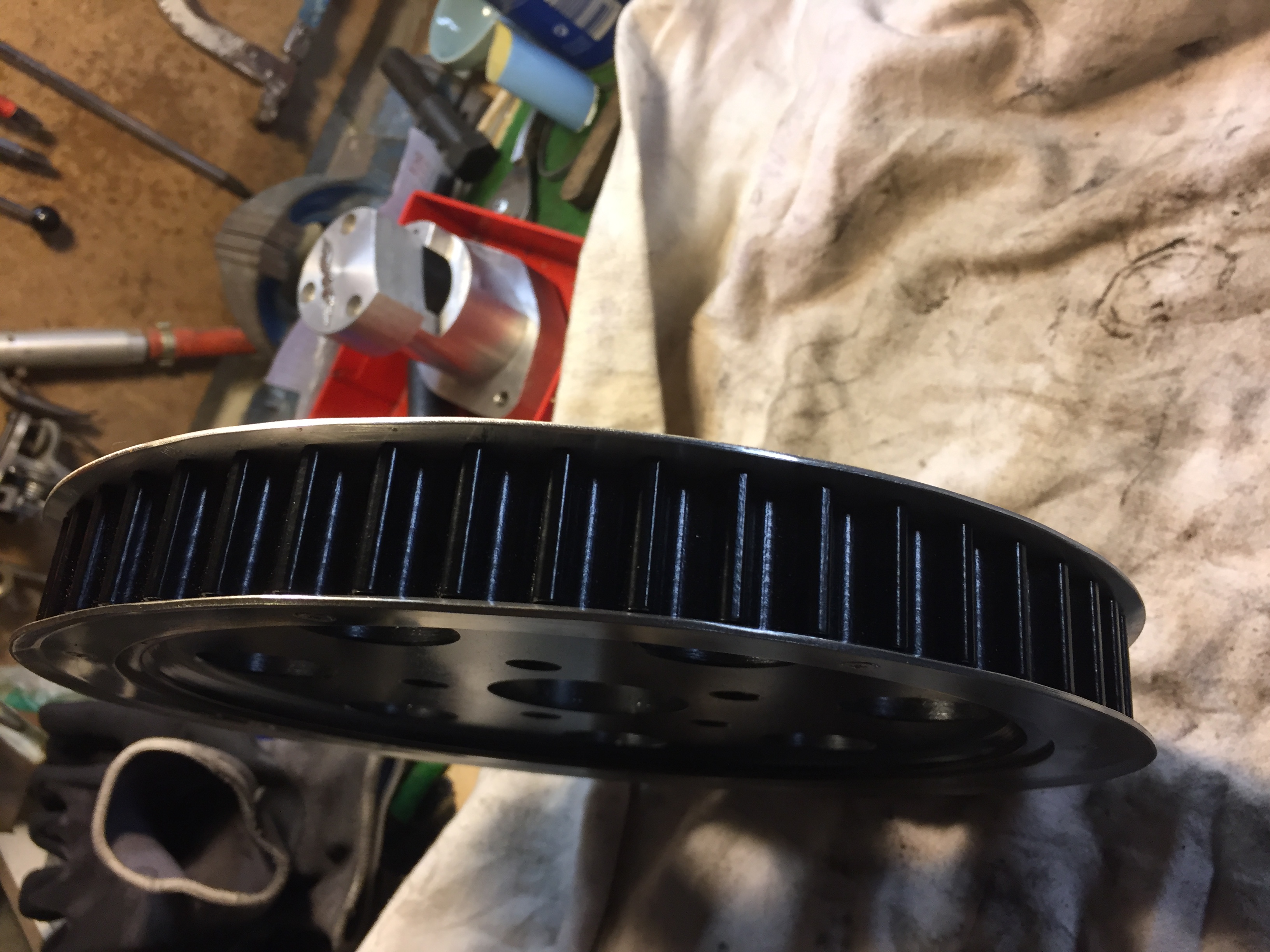 Problem 2: da das Übersetzungsverhältnis von 24 zu 46 Zähne(Kette) ungefähr beibehalten werden sollte, brauchte ich ein 29er Pully, was kein Problem war, aber das Riemenrad mit 56 Zähnen gab es nicht für HD. Also mal wieder in die Industriekiste geschaut und ein Riemenrad aus GG bestellt. Ein 13,8kg schweres Riemenrad kam dann ein paar Tage später an. Viel Arbeit…., Es folgten mehrere Stunden an der Drehbank mit dem Endresultat von ca. 3,2kg Mehrere Bohrungen, Bordscheiben aus Edelstahl ausgeläsert, Anlaufwinkel gedengelt, verbohrt und tauchlackiert. Alles vernünftig ausgerichtet, gespannt und nun ca. 8000km getestet – bin hochzufrieden!