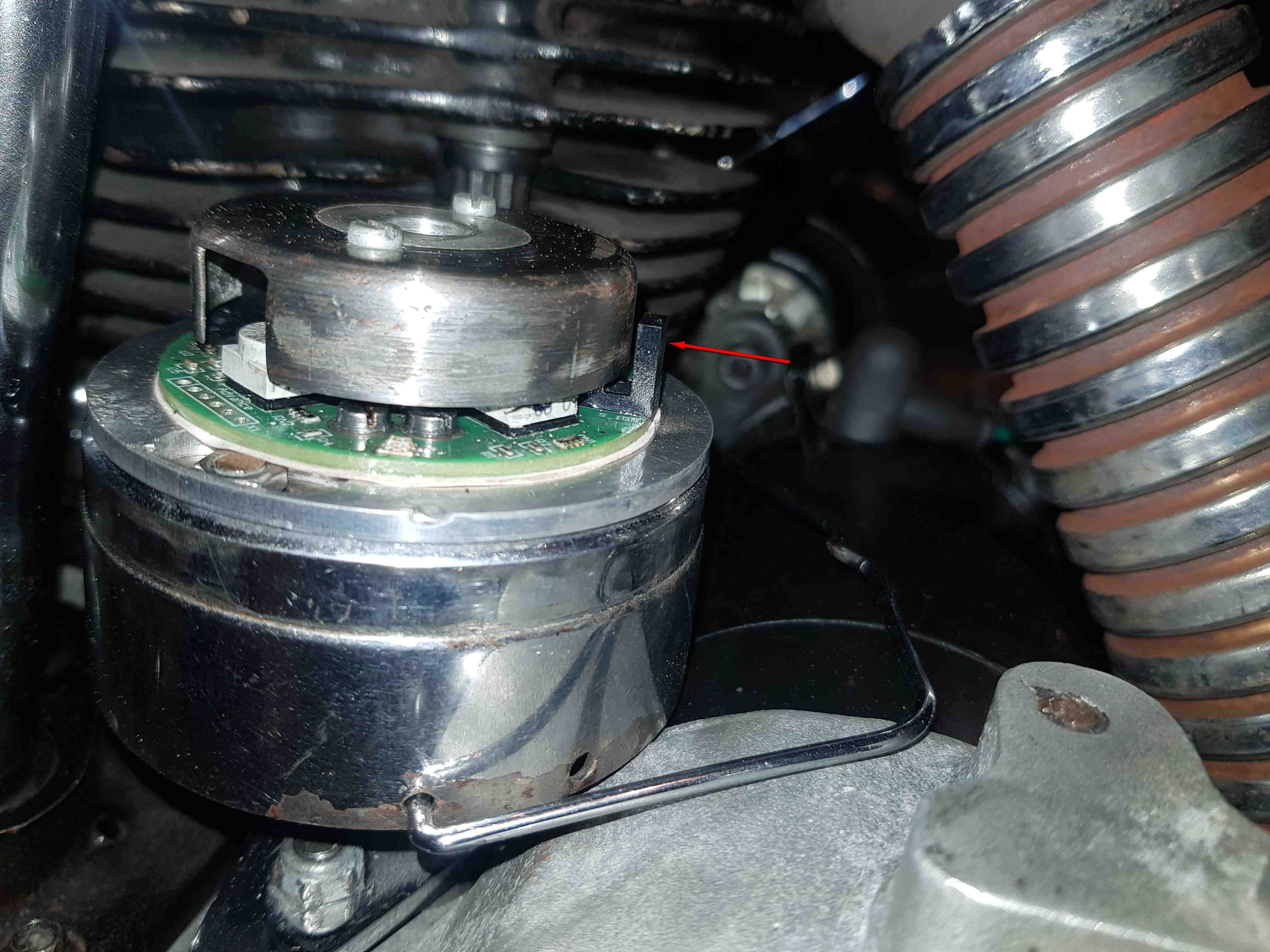 Also überprüft beim Einbau, ob genügend Spalt zwischen Rotor und Zündung vorhanden ist. Der Spalt kann recht groß sein, weil der eigentliche Hallsensor im oberen Viertel der „Gabel“ sitzt (roter Pfeil).