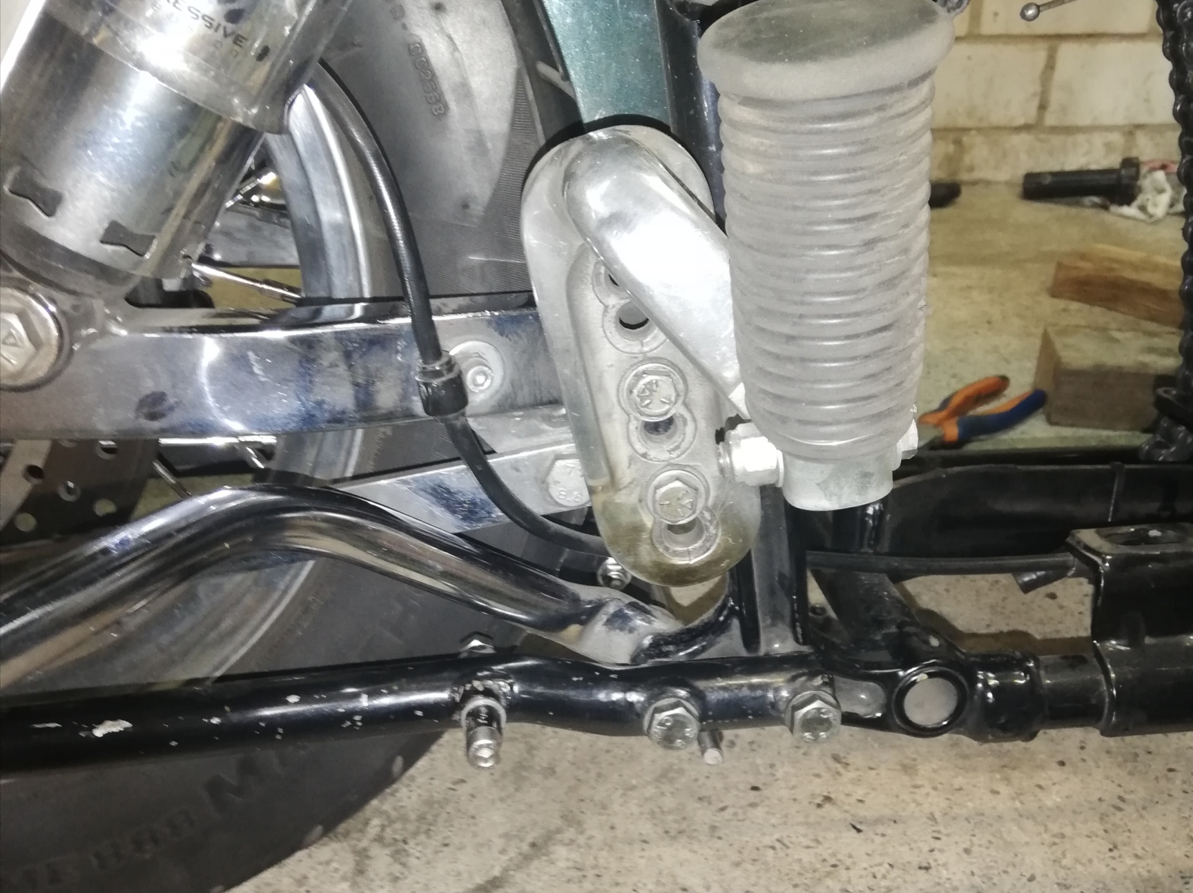 Oben ist klar. Statt der Distanzscheibe unter die Dämpfer Montage Bolzen. Unten sind am Rahmen zwei Bohrungen für den Auspuffhalter und ich hatte angenommen, dass eine davon auch zur Montage der Bügel genutzt wird.