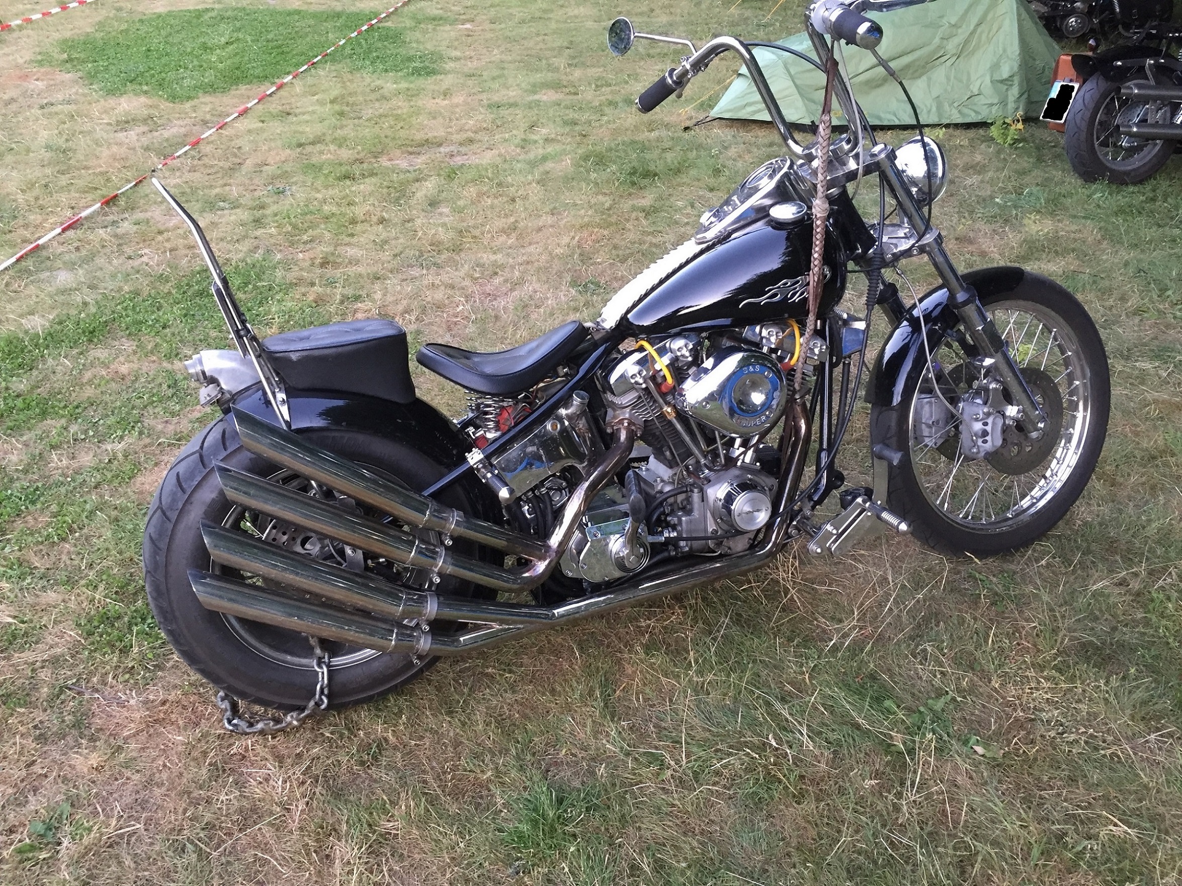 Also da ich mir denke dass das den einen oder anderen interessieren könnte schreibe ich hier mal einen kurzen Bericht zu meiner Idee und Umsetzung. Ich fahre meinen Starrahmen (S&S Motor, ca. 84“ mit STD-Köpfen, 2 Kerzen pro Kopf,[S&S Shovelköpfe gab es vor ca. 25 Jahren noch nicht als ich den Motor aus Einzelteilen aufgebaut hatte], Dyna Singelfire Zündung mit 2 Doppelspulen, Jims 6gang overdrive [sehr empfehlenswert]mit Anlasser und Eigenbauübertrieb, 3“ Primärbeltdrive, 20mm Sekundärbelt (115 Zähne), 200er auf 7“x15“) nun seit nunmehr über 30 Jahren, je nach finanziellen und technischen Möglichkeiten habe ich über die Jahre immer wieder optische und vor allen Dingen technische Verbesserrungen durchgeführt. Von dem damals gekauften Motorrad sind neben dem Rahmen nur noch der Ölfilter/Kühler und Reste des Spratorücklichtes übrig geblieben.