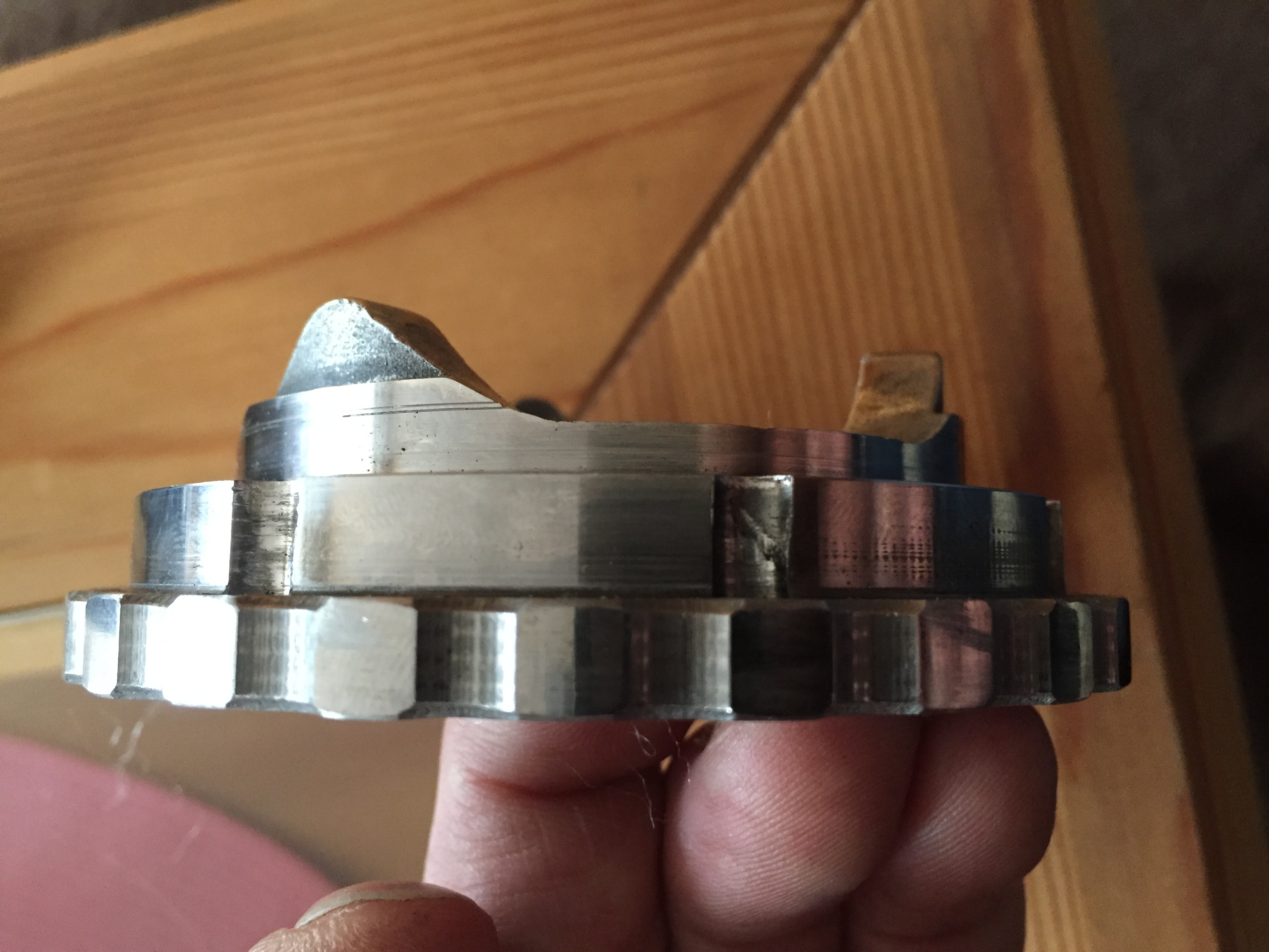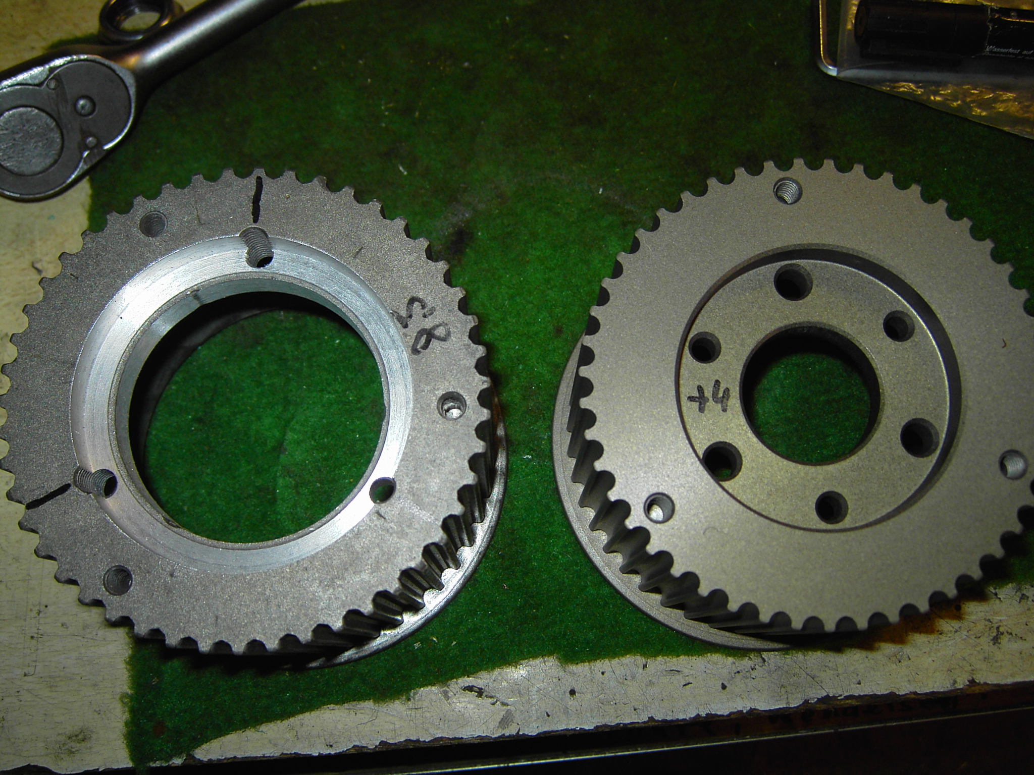 und das Doppelzahnrad mit dem Nockengegenstück bearbeitet,(10 HM-Schneidplatten verbraucht) gebohrt, Gewinde geschnitten….. Achtung: das Doppelzahnrad ist gehärtet, aber mit viel Gefühl und Kühlmittel und Schneidfett geht es. HM-Bohrer benutzen! Bohren vor dem Drehen!!