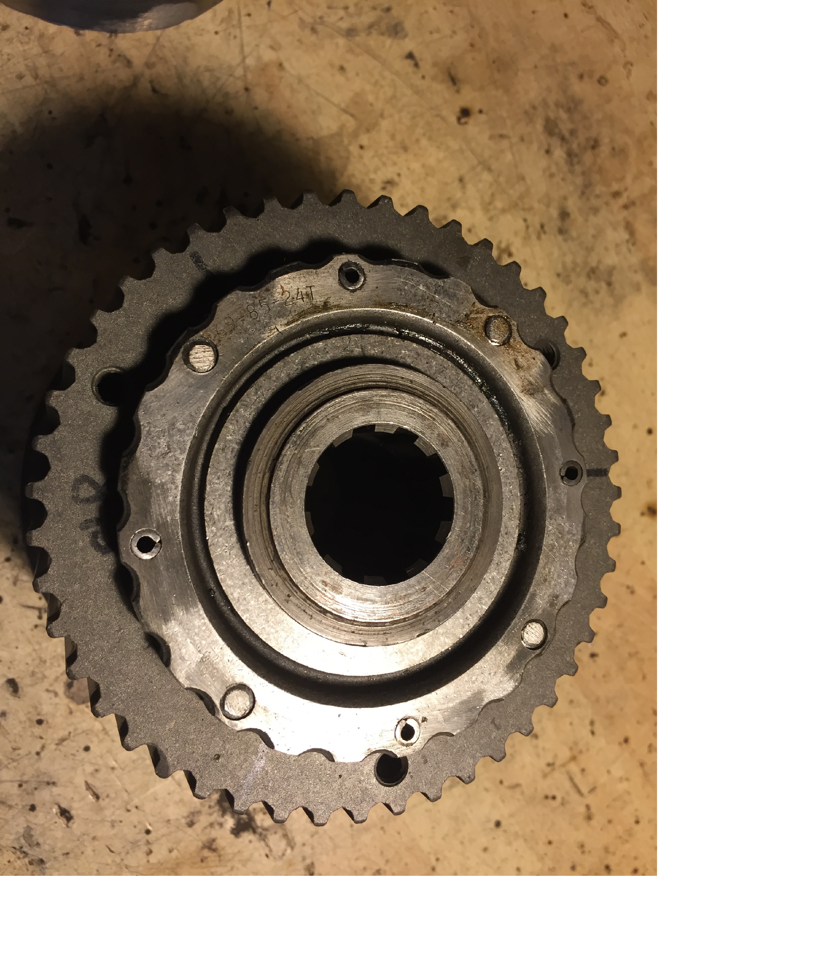 Der originale BDL verzahnte Stahladapter der in den Pully geschraubt und verstiftet wird, wird mit 3x 5/16 und 3x 8mm Spannstiften gehalten. Für diesen Durchmesser ist bei dem bearbeitetem Doppelzahnrad leider nicht genug „Fleisch“ vorhanden. Ich habe mich stattdessen für 4x M6 Inbusschrauben und 4x 6mm Spannstifte entschieden. In der Querschnittsumme ist es zwar etwas weniger aber es sollte nach meiner Erfahrung/Meinung ausreichend sein. Zumal die Kraftübertragung durch die Kurbelwelle und im Schiebebetrieb durch das Hinterrad durch den Ruckdämpfer ja gedämpft werden, also weniger Belastung auftritt als bei der starren Verbindung.