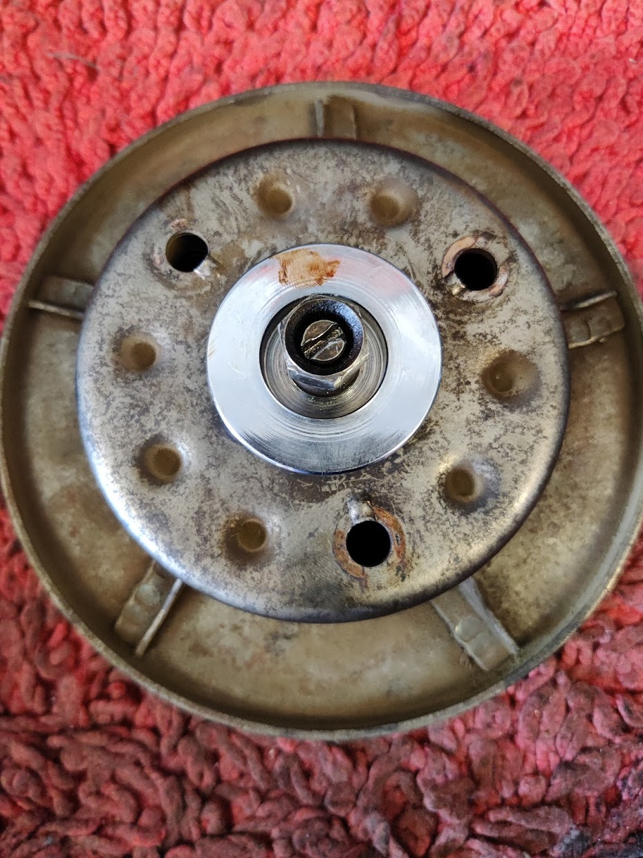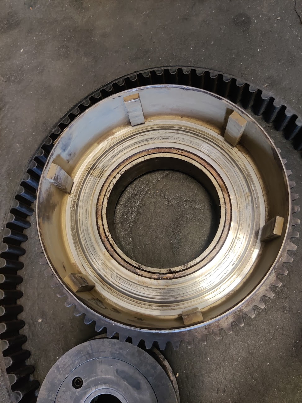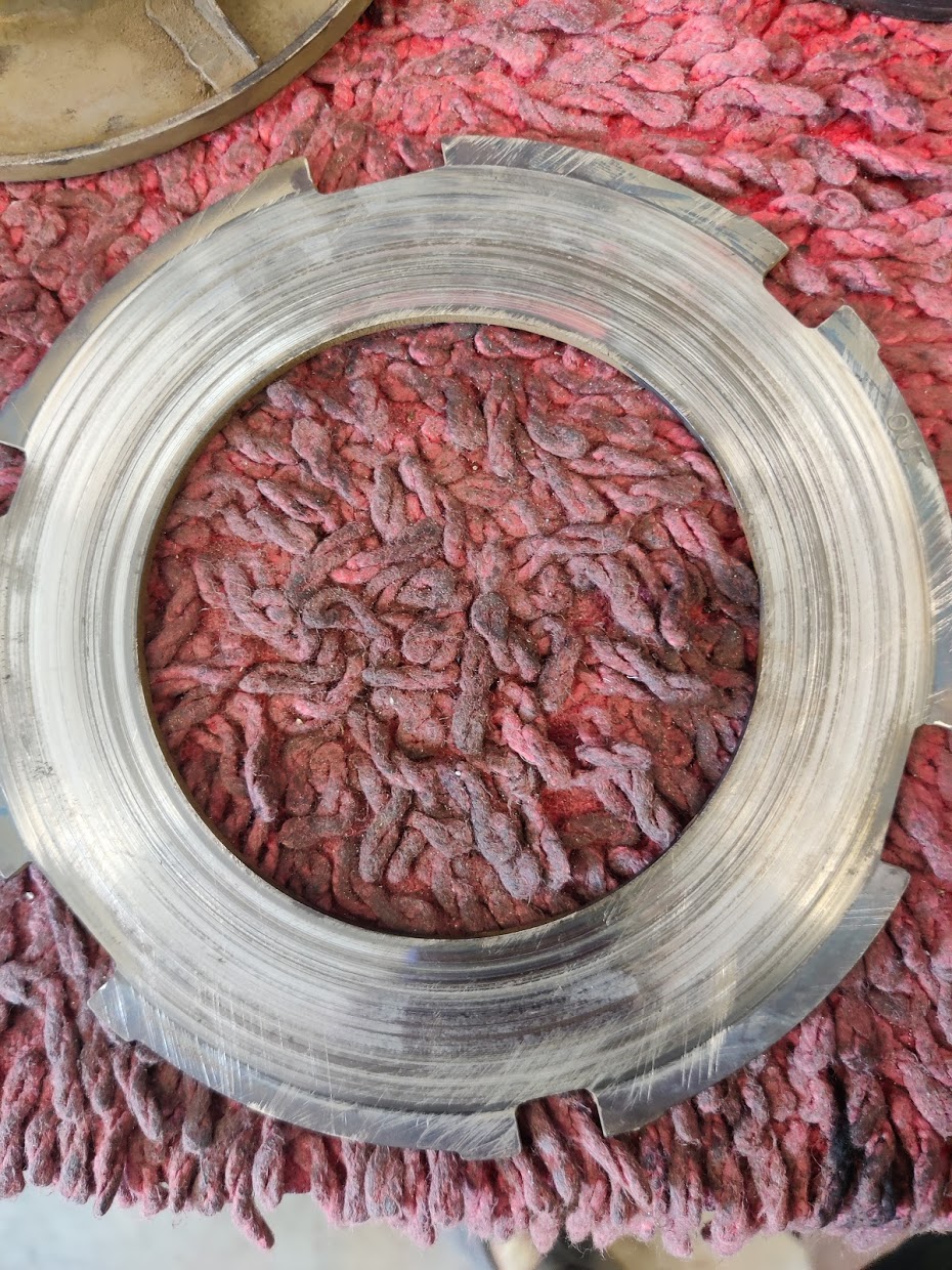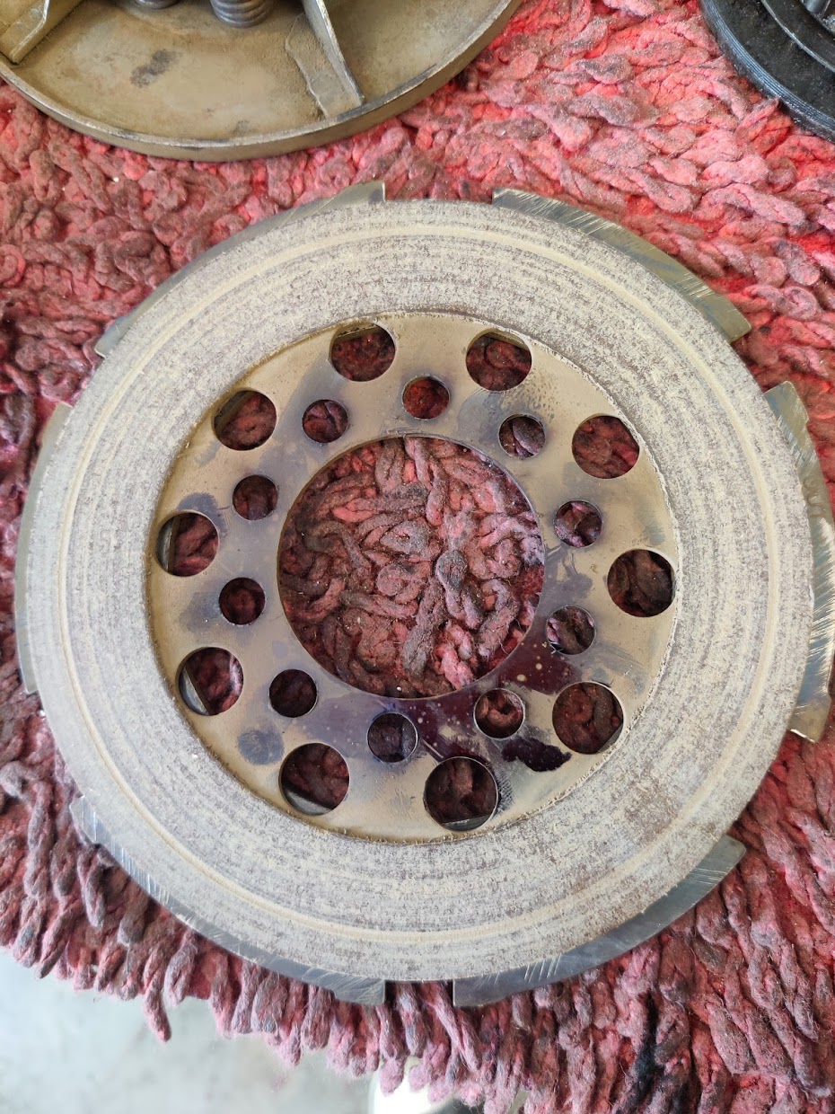 Stahlscheiben haben Riefen, Beläge ebenfalls. Kupplungsnabe ist der Plastikring der angenietet ist recht lose, Kupplungskorb hat innen an der Stahlscheibe Riefen. Zum Glück habe ich noch einen fast neuen, sind ja kaum noch zu bekommen für die Sturgis.
