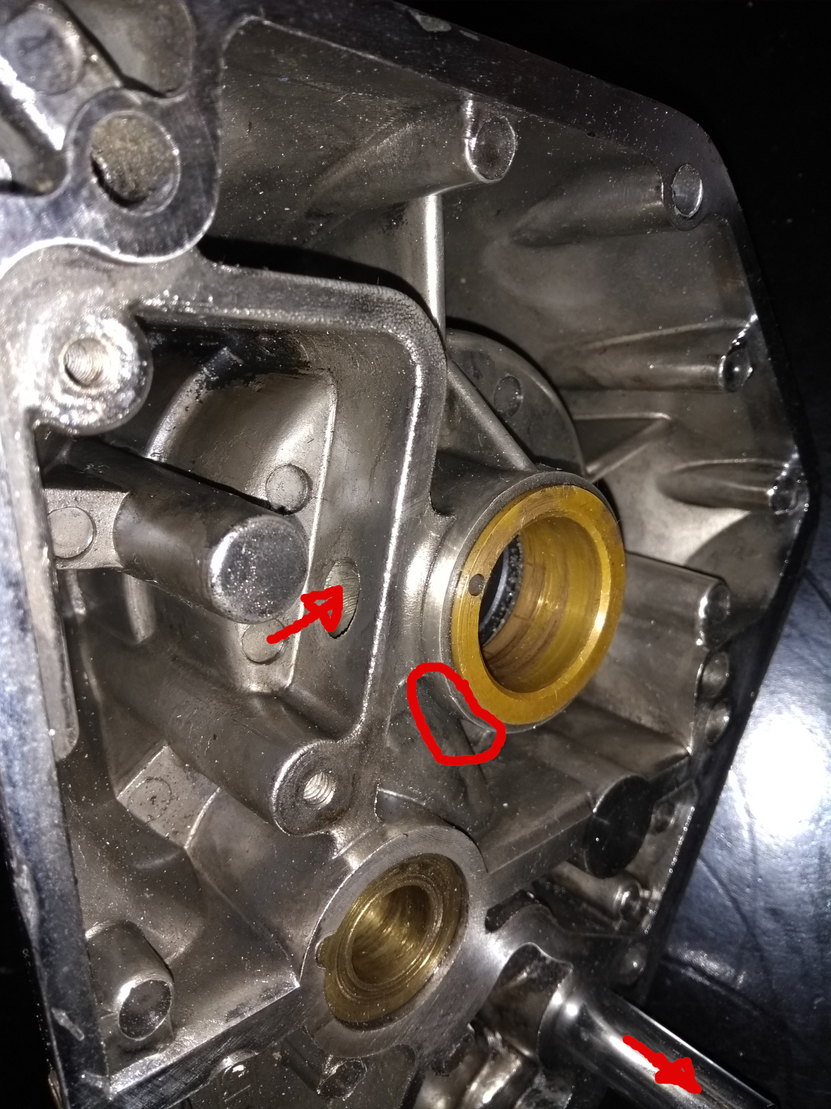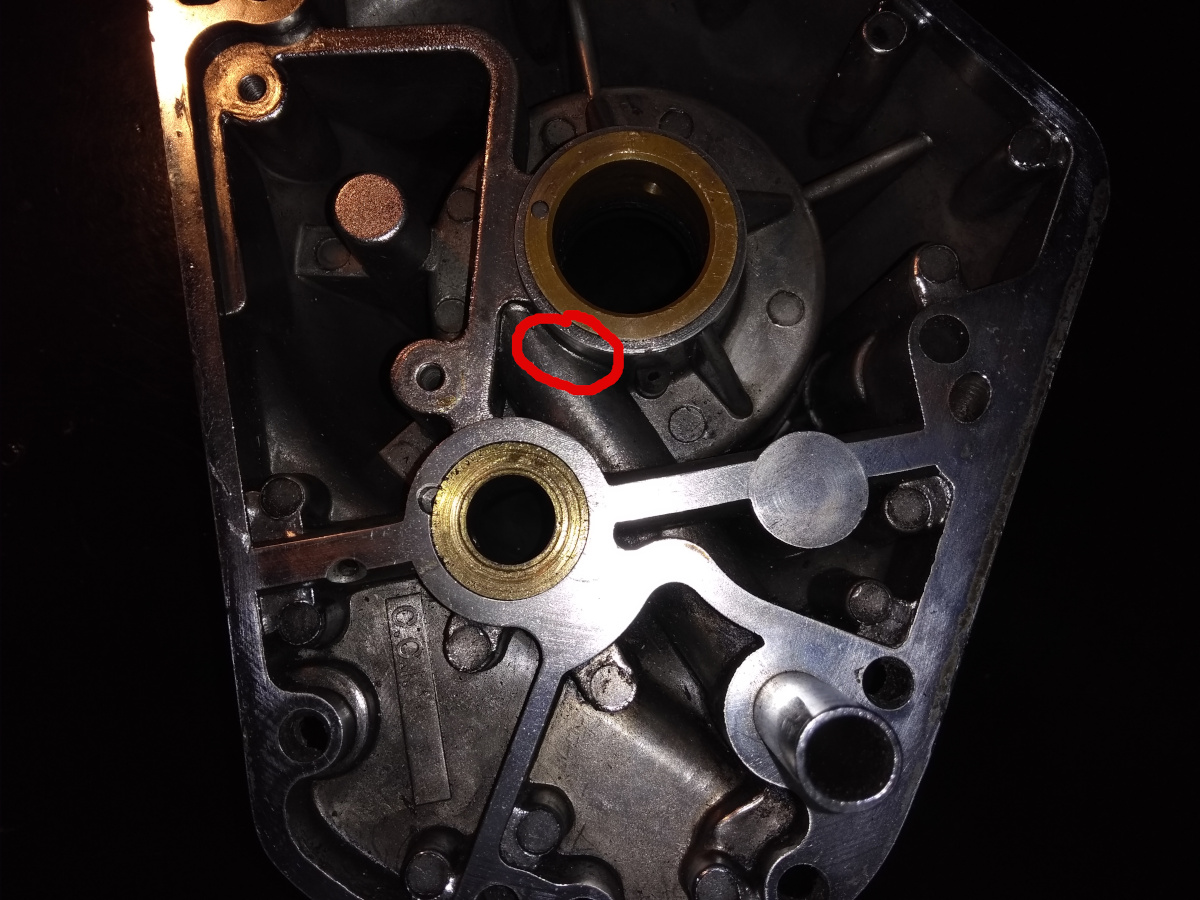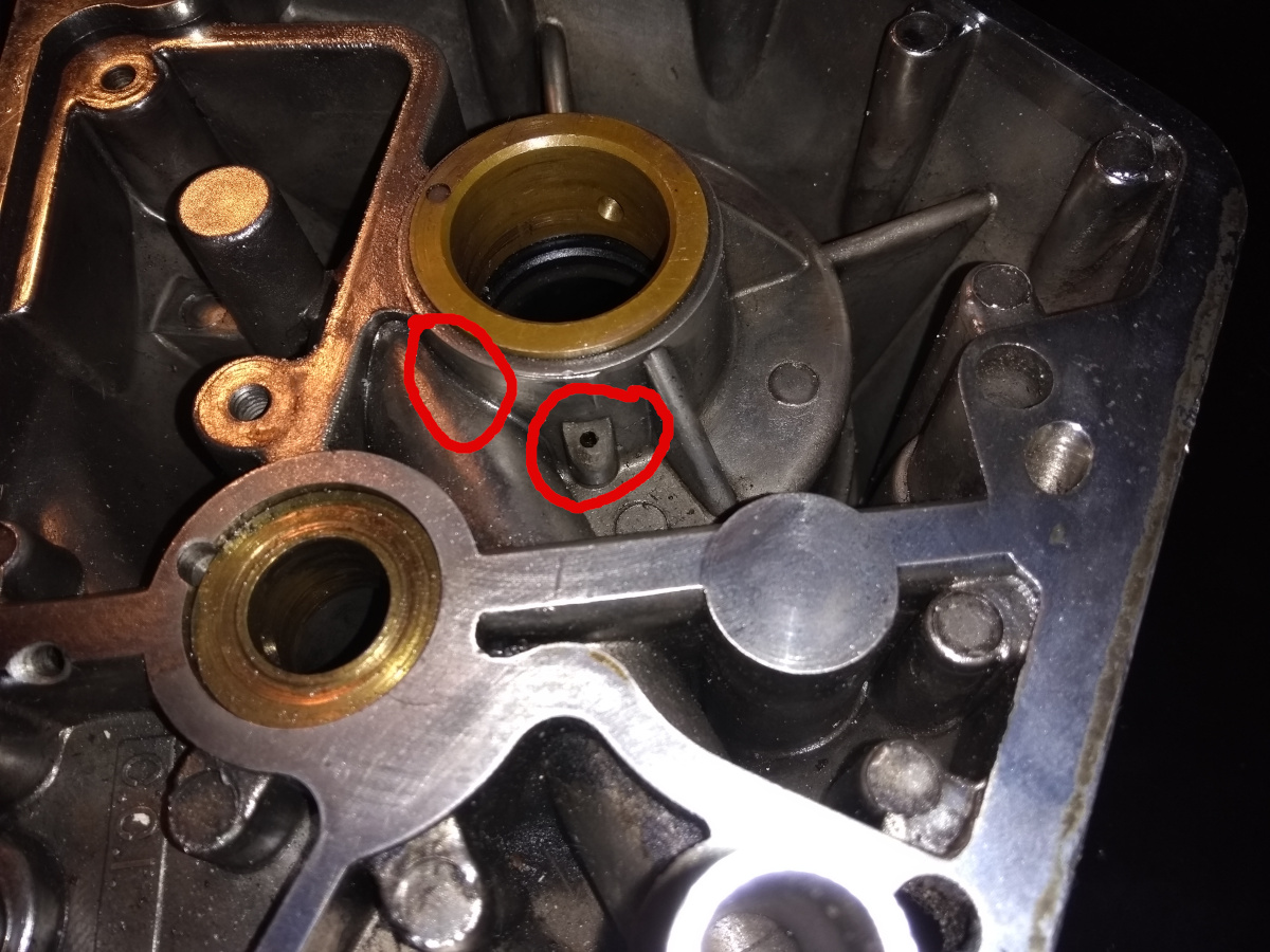 Das zugeklebte Loch gehört da nicht hin. So wie das aussieht, hat da wohl mal einer den Sitz unter dem Wellendichtring nachgearbeitet und wohl dabei den Ölkanal darunter erwischt.