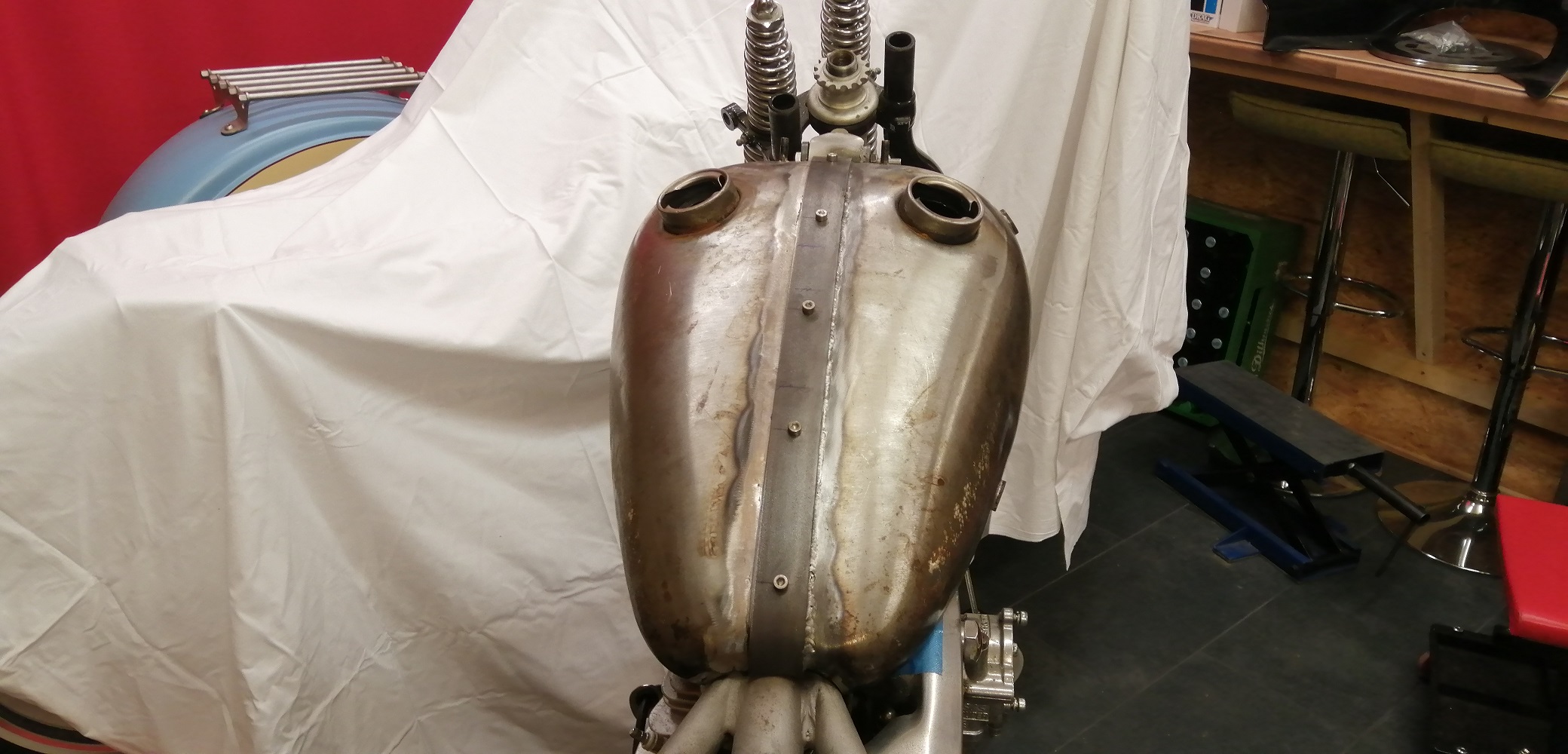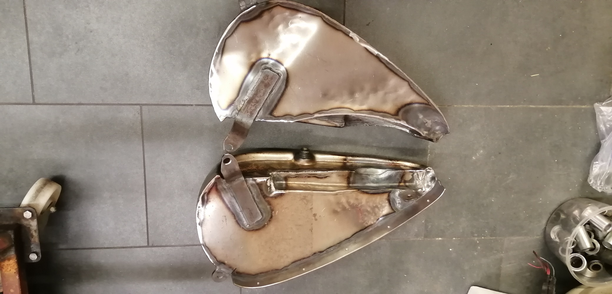 Der Tank ist ja noch nicht fertig. Er sollte ja wie von den V-Modellen aussehen. Die Herausforderung war, das beide Tankhälften in der Mitte perfekt zusammen passen. Das war eine Fummelei, aber es hat sich gelohnt. Den gebogenen Flachstahl habe ich an die rechte Tankhälfte geschweißt. Damit verbinde ich beide Tankhälften. Die Gewindestücken für eine analoge Tankanzeige und die Überlaufröhrchen habe ich mit Hartlot verlötet.