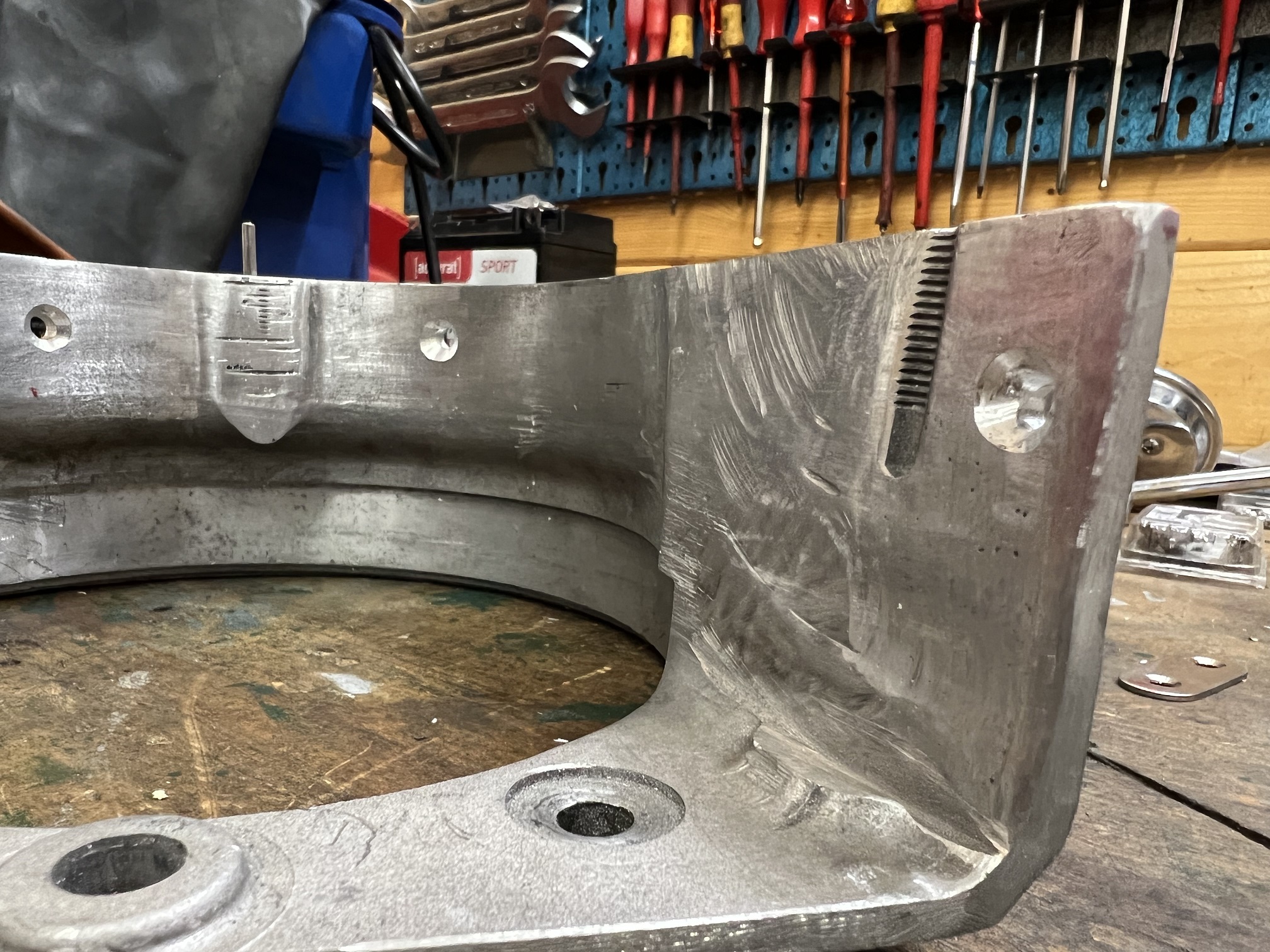 Also kurzerhand den Primärkasten auf die gewünschte Länge abgeflext und die störenden inneren Ausstülpungen für die Befestigungsschrauben vom äußeren zum inneren Primärs entfernt. Damit ist genug Platz für Beltpulley und Belt aber keine Möglichkeit mehr vorhanden die beiden Hälften des Primärs zu verbinden.