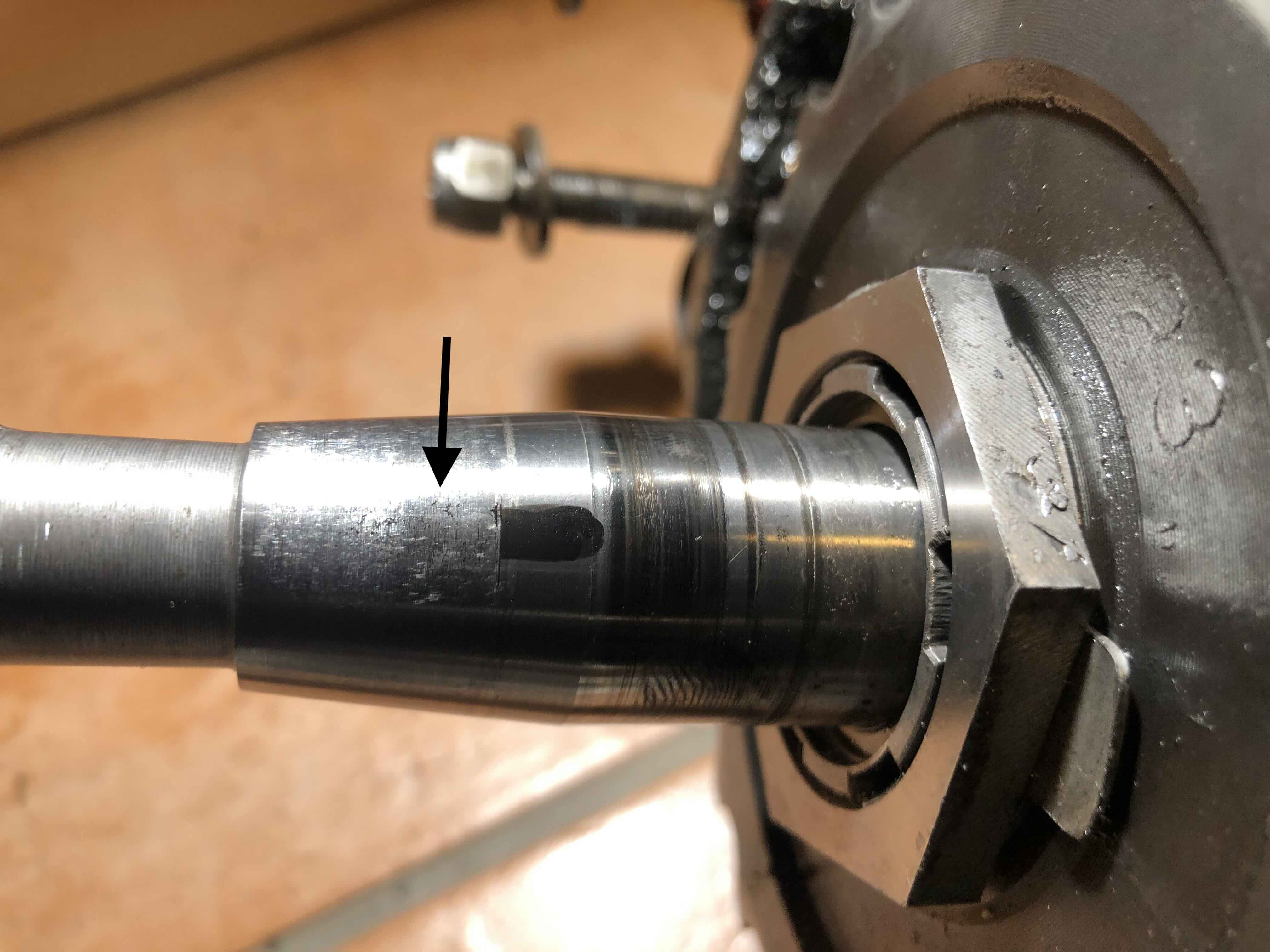 Moin, da ist tatsächlich auf der Höhe des letztes Endes der Nut, wo die Scheibenfeder sitzt, etwas zu sehen. Zieht sich wie ein Ring um den Konus. Spürbar ist das nicht, der Konus ist nicht Rauh, fühlt sich alles sehr glatt und ohne Unebenheiten an.