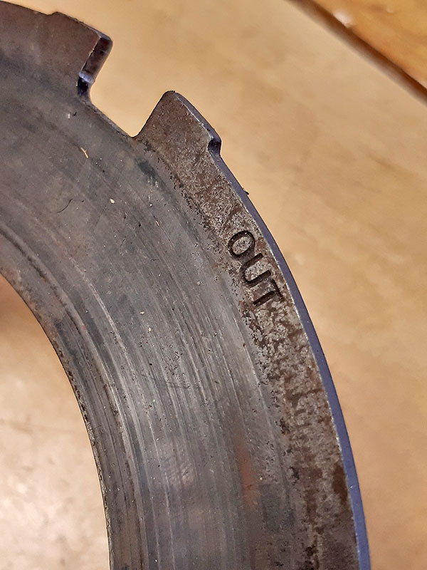 Die Scheiben mit Anti-Klapper-Feder sind mit OUT beschriftet damit die Federn in der richtigen Richtung sitzen (in Fahrtrichtung nach vorne zeigend).