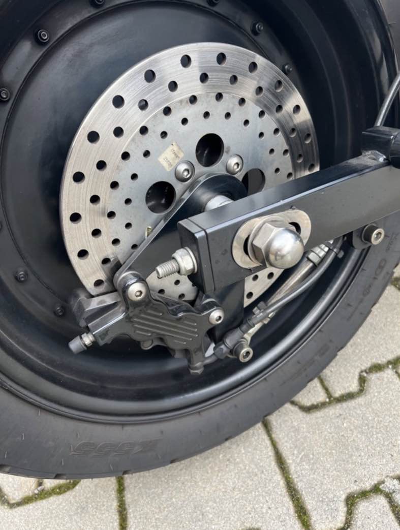 Ich habe mich u.a. bei dem hinteren Scheibenrad auf die Suche nach Kennzeichnungen des Herstellers und der Abmessungen gemacht und lediglich das Kürzel HSP und eine Nummer 0397883 auf dem Felgenring gefunden. Es ist eine verbreiterte, geschraubte Felge. Aufgezogen ist ein Reifen der Dimension 170/70 B16 M/C 75H. Das ganze ist in einer verbreiterten Schwinge von SCS verbaut. Jetzt kommt ihr ins Spiel.