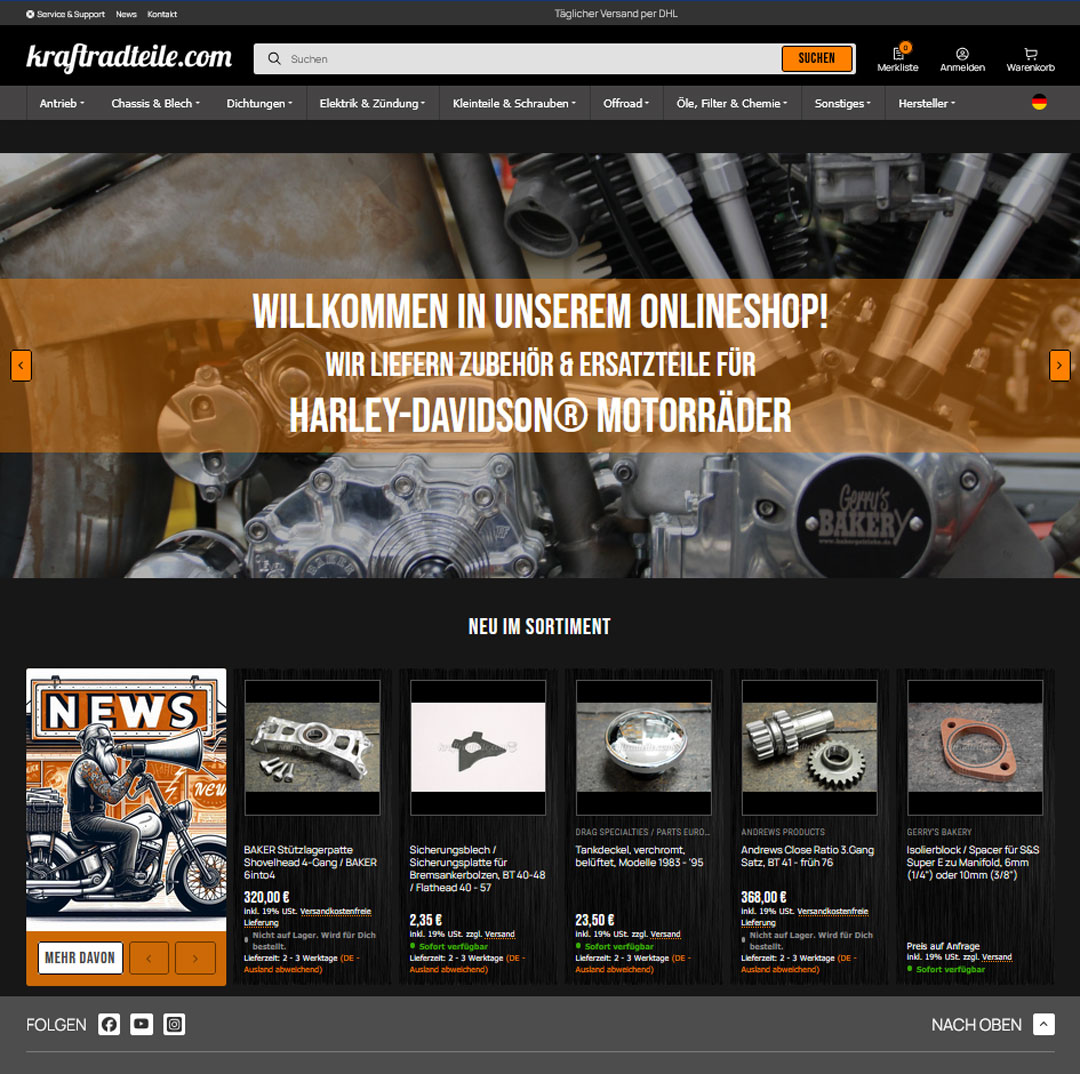 Ladies & Gentlemen, unser neuer Onlineshop ist startklar! Da der alte Shop das technische Alter "Knucklehead" erreicht hatte war es Zeit mal upzudaten und abzustauben. Optimiert für mobile Endgeräte damit Ihr auch vom Pannenstreifen aus schnell Ersatzteile beschaffen könnt. - Guckt mal rein. Wir freuen uns auf Eure Bestellungen!