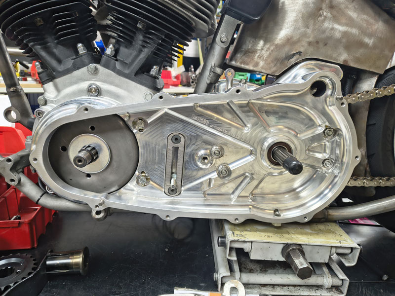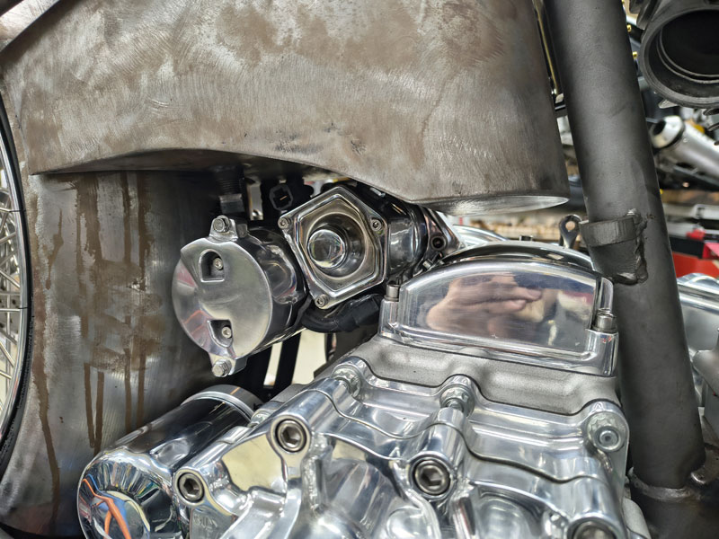 Als Primär kommt der ebenfalls nicht mehr erhältliche BAKER TinType Primary zum Einsatz. Aus dem Vollen gefräster Primärkasten im Stil der Blechprimärkästen. Da ich auch nicht jünger werde habe ich mich "damals" für die E-Start Version entschieden. Am Primär hängt ein polierter Spyke Super Torque 1.4kW Anlasser.