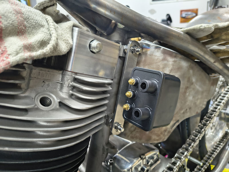 Die Zündspule kommt an den klassischen Platz links am Sattelrohr. Hatte erst überlegt irgendwas mittig vom Motor zu platzieren, gefiel mir aber nicht.