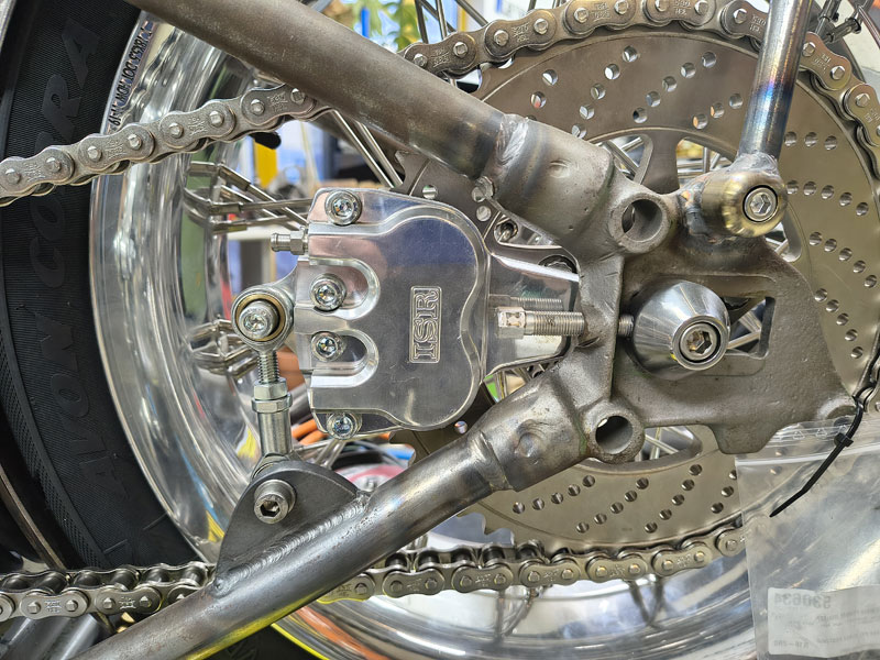 Die Aufnahme für den Bremsanker der 4-Kolben ISR-Ritzelbremse ist angeschweißt (Danke Kabel) und die Bremse platziert.