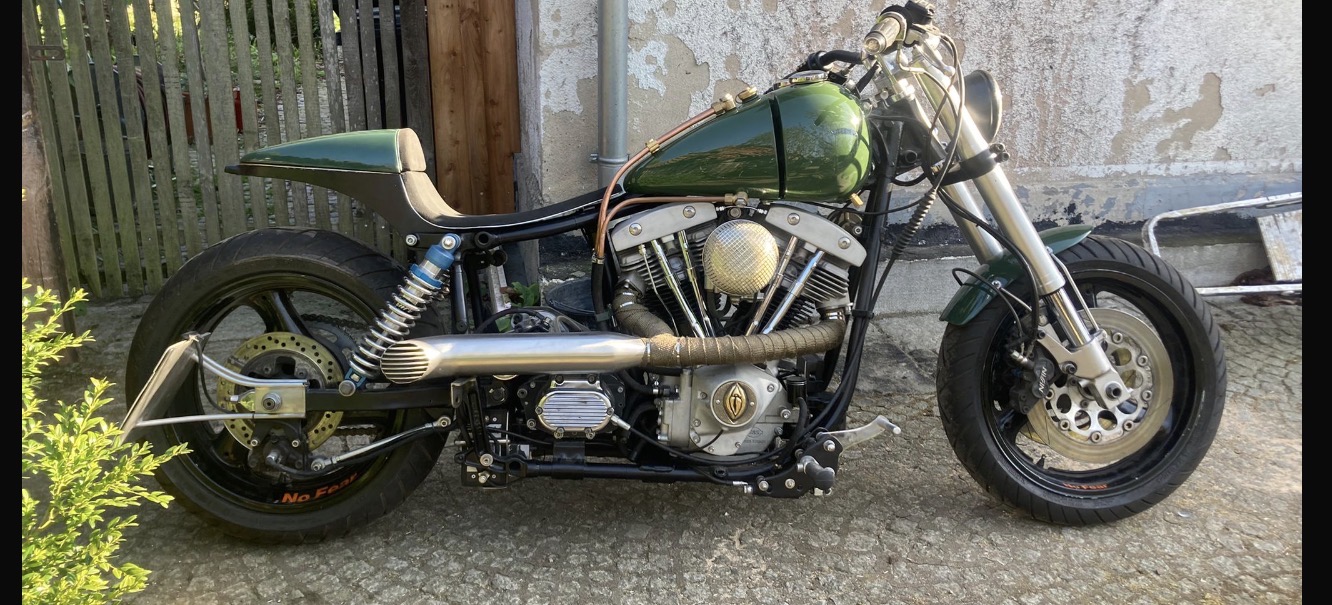 18 zoll alufelgen auf sportsternaben gespeicht, 1340er s&s, offener primär, 6 gang evo-getriebe. schmaler zubehörtank und gfk höcker.