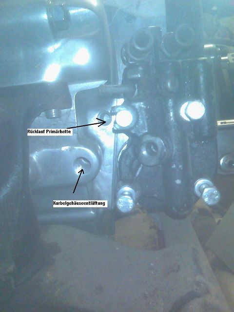Ich frage deshalb, weil zwischen Ölpumpe und dem Anschluss für die Gehäuseentlüftung noch ein Anschluss am Motorblock ist. Und zwar für die Rücklaufleitung der Primärkettenschmierung. Da kommt man ohne die Ölpumpe abzubauen gaaanz bescheiden ran. Normalerweise sollte bei Umbau auf Belt der Anschluss samt Schlauch entfernt und das Loch im Motorblock mit einer Madenschraube verschlossen werden. Wer aber kein Bock hat auf die Fummelei, schneidet irgendwo den Schlauch ab und verschliesst den mit einer Schraube. Deshalb schau da genau nach.