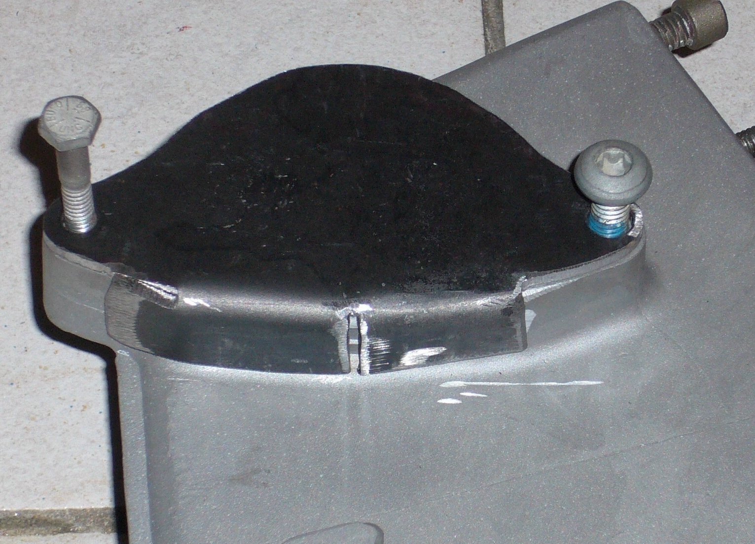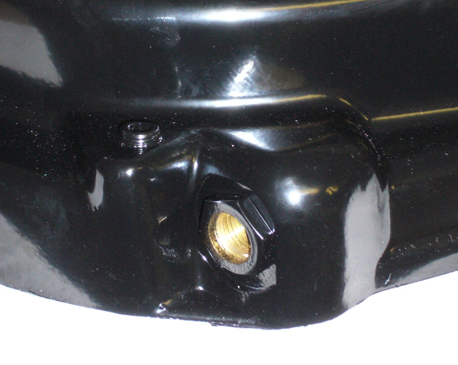 Für die Runde Bohrung nimmst Du einfach zwei große Unterlegscheiben, eine Innen, eine Außen und dichtest die äussere mit Dichtkarton ab. Man kann auch sehr schön den Zuleitungsanschluss direkt hinter dem großen Loc für den Mtoranschluss sehen, auf den Du ein Stück gebogenen Schlauch stecken kannst