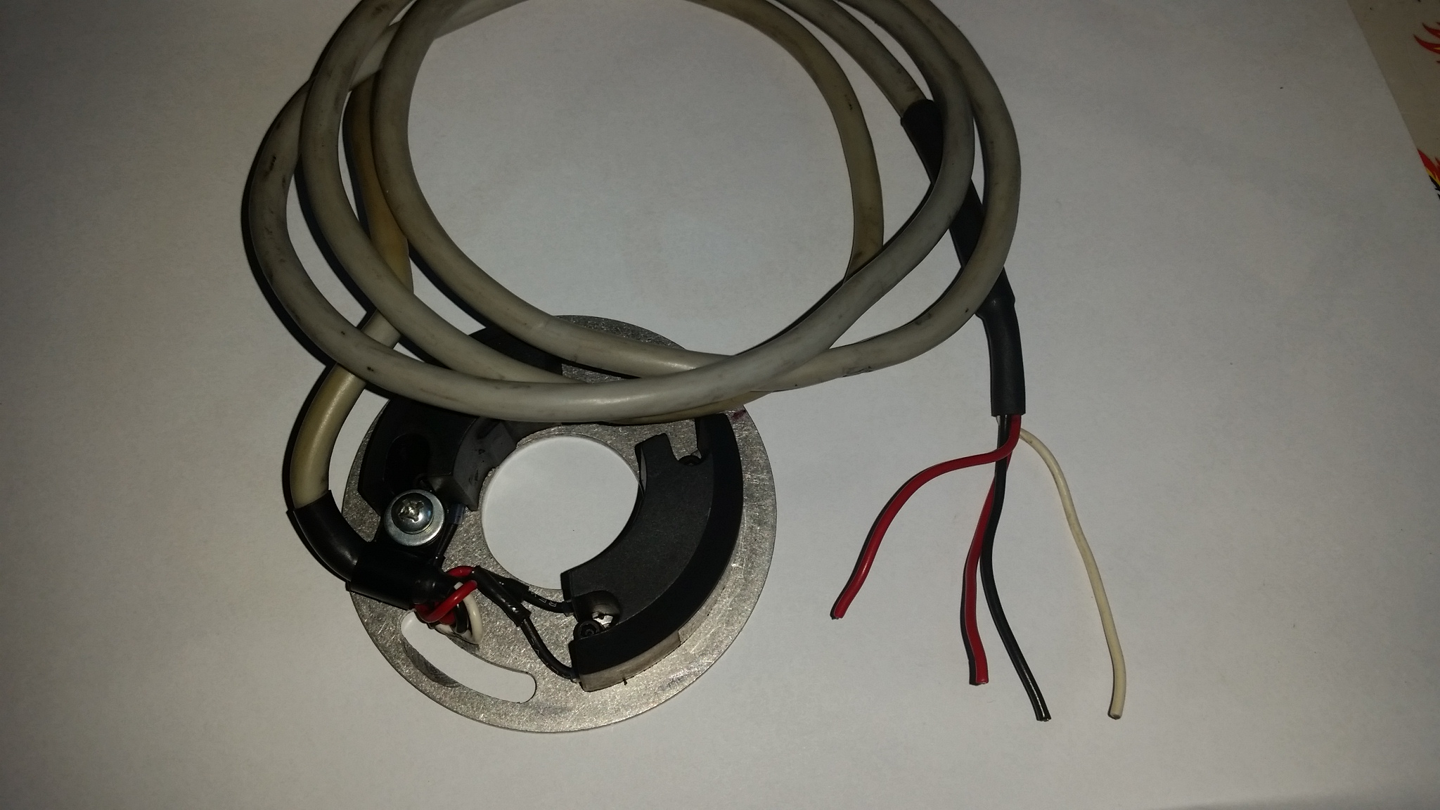 von der Zündung kommen 2 mal rot( vermutlich je 1 mal minus pro Zylinder), und ein mal weiß und ein mal schwarz. ich vermute schwarz geht zum Zündschloß an plus, vom Zündschloß ein weiteres Kabel zusammen mit dem weißen kabel an plus an der Zündspule.