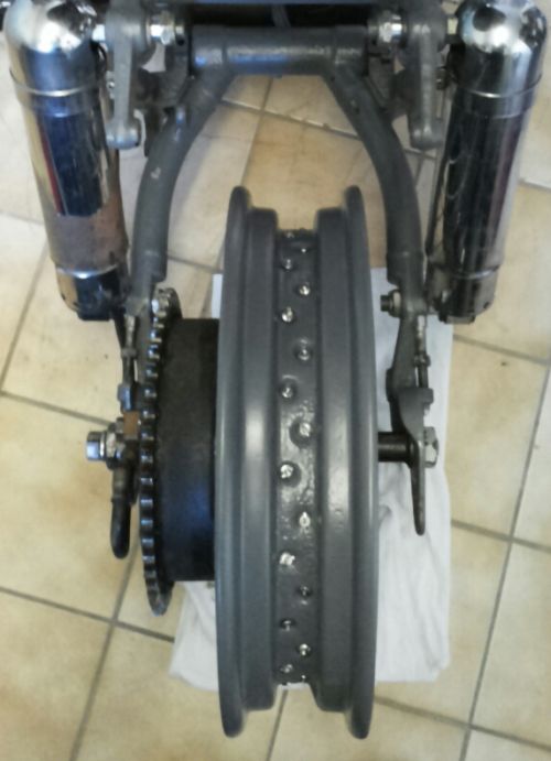 001.jpg (403 KB)Jetzt fand er das aber seltsam, dass das so "komisch" hingezogen werden muss und hat mich gebeten, das Rad lieber mal probehalber einzubauen, bevor er nun überstehende Speichen abschleift etc.