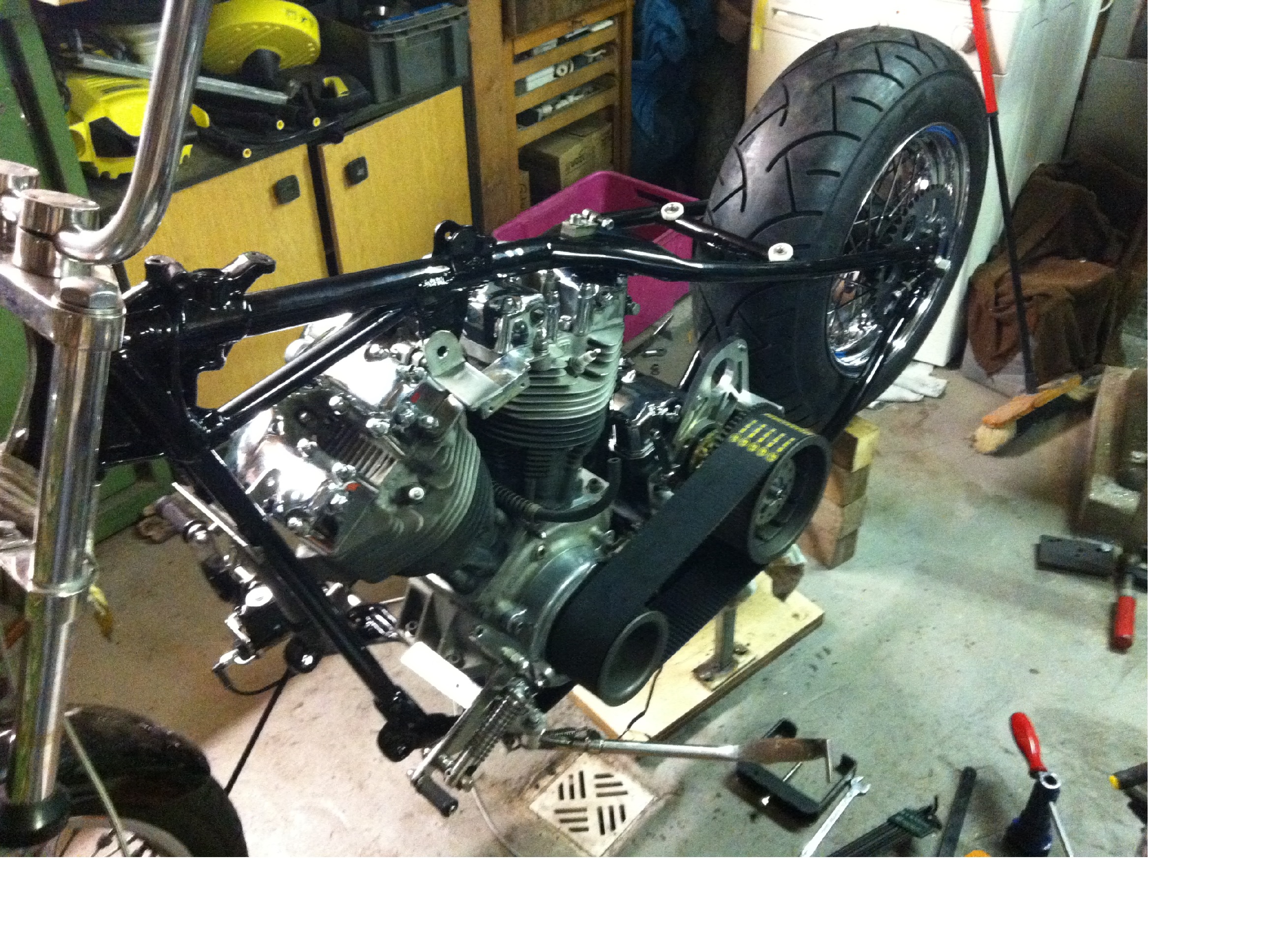 Schwingenrahmen mit 3" Belt: benötigt eine neue Getriebegrundplatte mit Versatz (das Mass vom Versatz habe ich leider nicht zur Hand) plus Änderrung des 5. Getriebeaufnahmepunktes. Orginal Öltank kann so beibehalten werden, egal ob mit oder ohne Anlasser. Das schwierigste ist das möglichst genaue Mass für den Schwingenausschnitt zu finden, denn dadurch kann man das hintere obere Gewinde für das Stützlager erhalten. Das Stützlager bekommt auch noch eine Ausfäsung wegen der Schwinge. Sattelrohr deformieren war nicht notwendig.