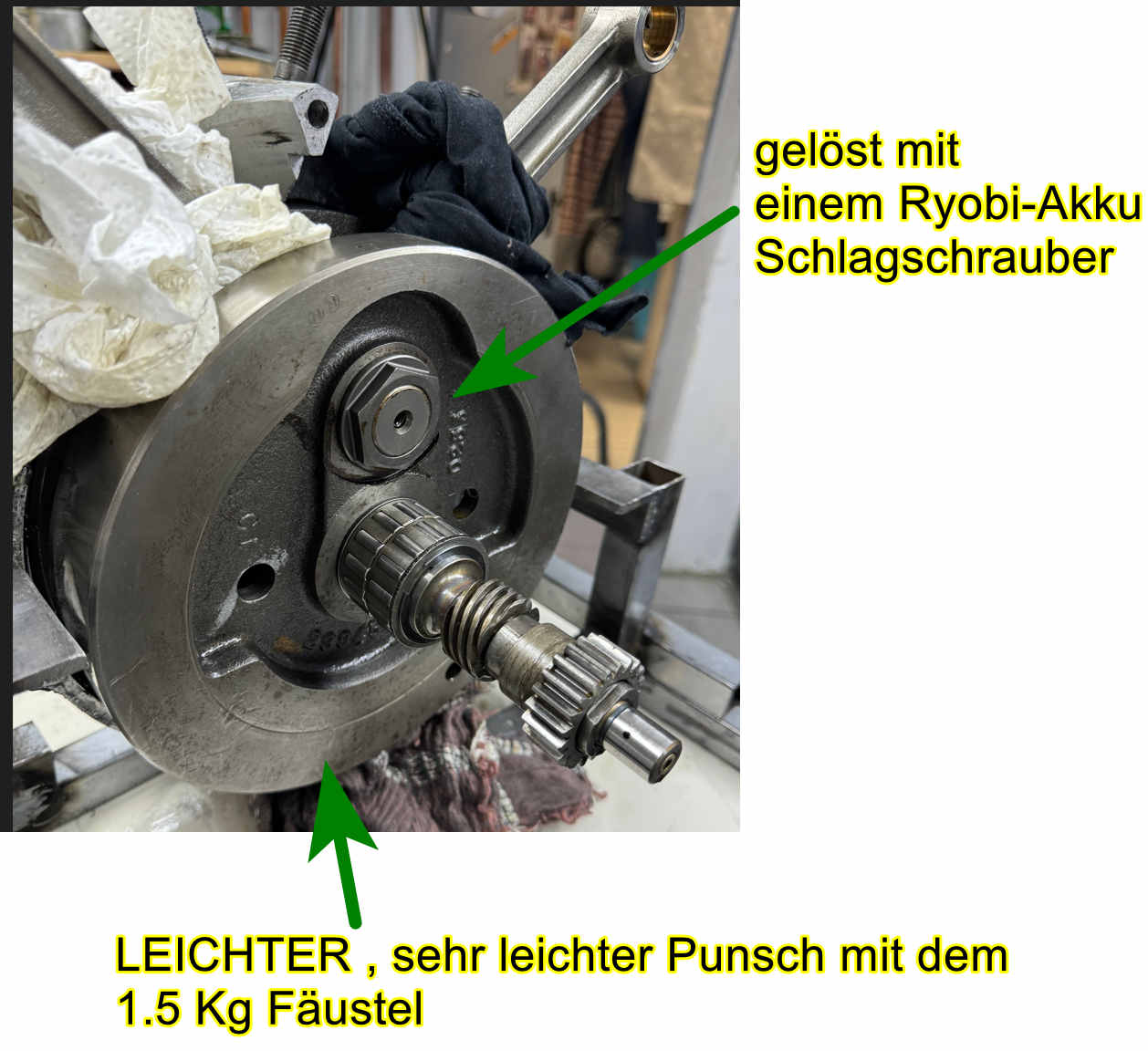Grüner Pfeil: 2 - An der freigelegten Schwungscheibe die Pleuelzapfen-Mutter gelöst und mit einem 1.5 Kg Hammer leicht auf die untere Wange geklopft. 3- die Schwungscheibe abgenommen und dann die Mutter gelöst vom Sprocketshaft. Die Schwungscheibe viel mir dann entgegen!