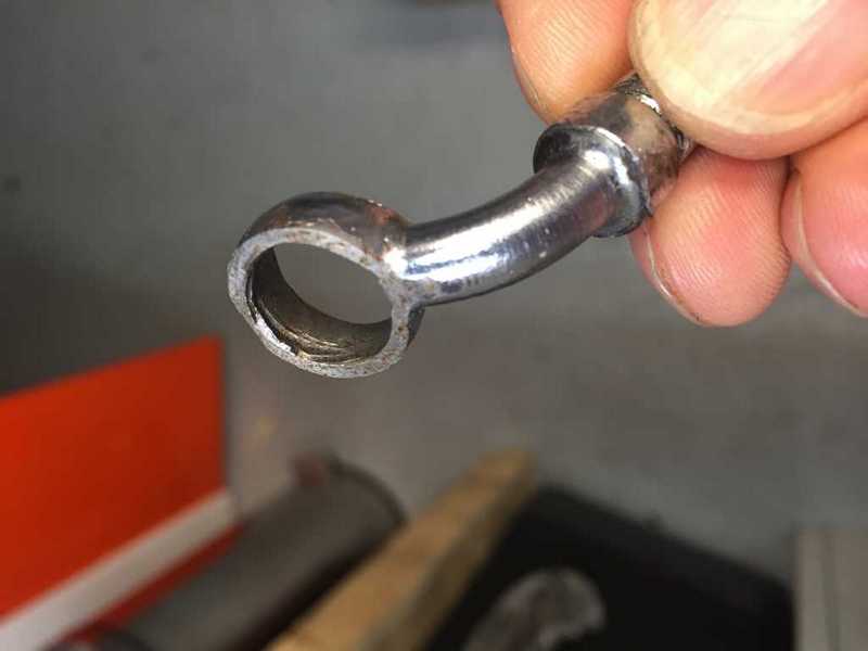 Der Vorbesitzer hatte die Bremsleitung mittels aufgefeiltem Banjo-Fitting und ner Hohlschraube aus ner Krabbelkiste irgendwie dicht installiert.