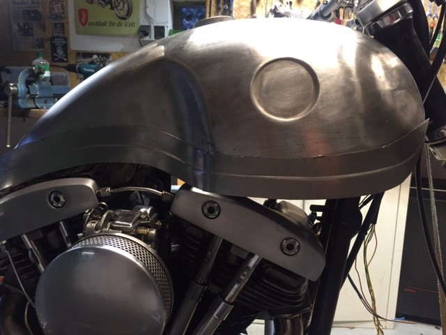Der Tank nimmt langsam Form an. Bleche sind geschnitten und gekniffen. hinten schmiegt er sich an die Rahmenrohre. Jetzt alles noch verschweißen und schleifen. Halterungen setzen, Benzinhahnanschluss einschweißen usw.Der Tank sitzt so natürlich später nicht auf dem Rahmen. Der muss noch ein Stück zurück.