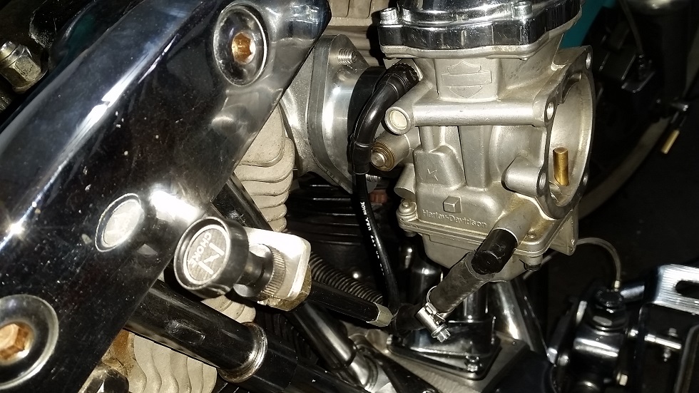 Folgendes: Ich möcht`meiner Shovel den "Walter"-Lufi gönnen, und dabei den CV-Gaser etwas näher an den Motor rücken. Verbaut hab ich jetzt den Big Sucker-Lufi mit Manifoldadapter mit Gummiring ( dem Aufpress-Teil trau `ich nicht) und Pertinax-Isolator. Der soll weg , um wertvolle Baubreite zu sparen.