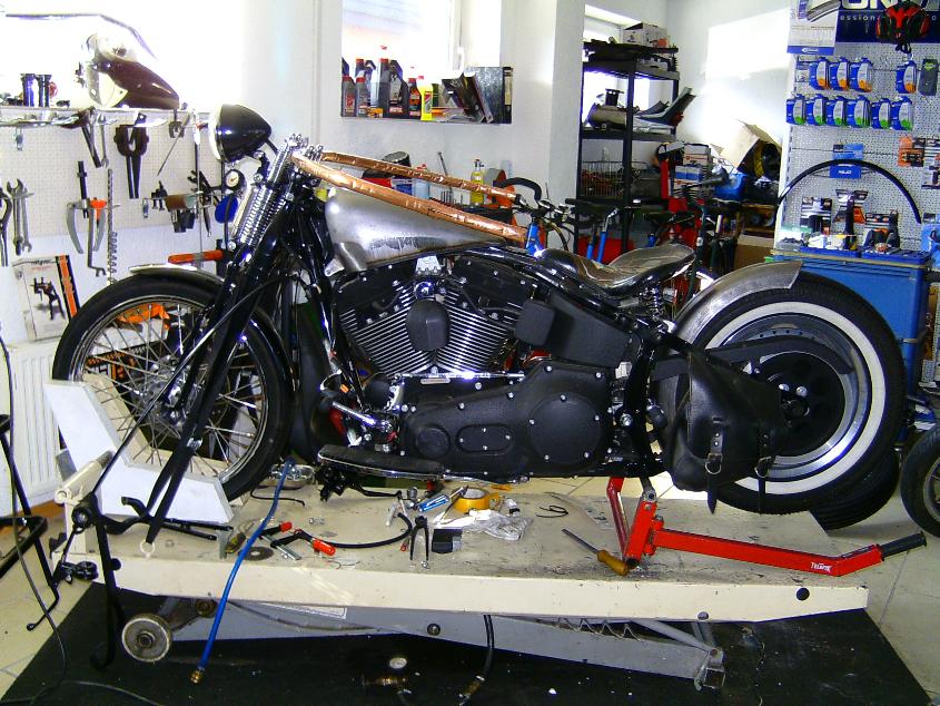 Ein TC oder ein Evo ist nun mal kein Shovel oder Pan, das ist ganz klar und dem war ich mir beim Kauf bewusst. Ich wollte die Starrrahmen-Optik behalten, deswegen ist's ein Softail-Rahmen geworden und ich wollte einen schwarzen Motor, deshalb eine Night-Train, ich wollte 'ne Springergabel und Trittbretter und genau das war die Entscheidung den Stuhl zu kaufen, einfach weil die Basis stimmte.