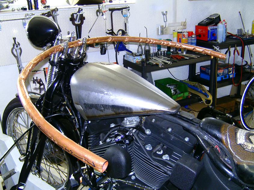 Da ich kein Geld scheißen kann, wird das Grundgerüst jetzt zusammengebaut, gefahren und nach und nach kommen kleine Veränderungen, wie z.B. Tacho, Handschaltung, Fußkupplung, große Ledertasche für den Urlaub oder die kleine Wochenendfahrt nach Schweden, andere Handamaturen usw.