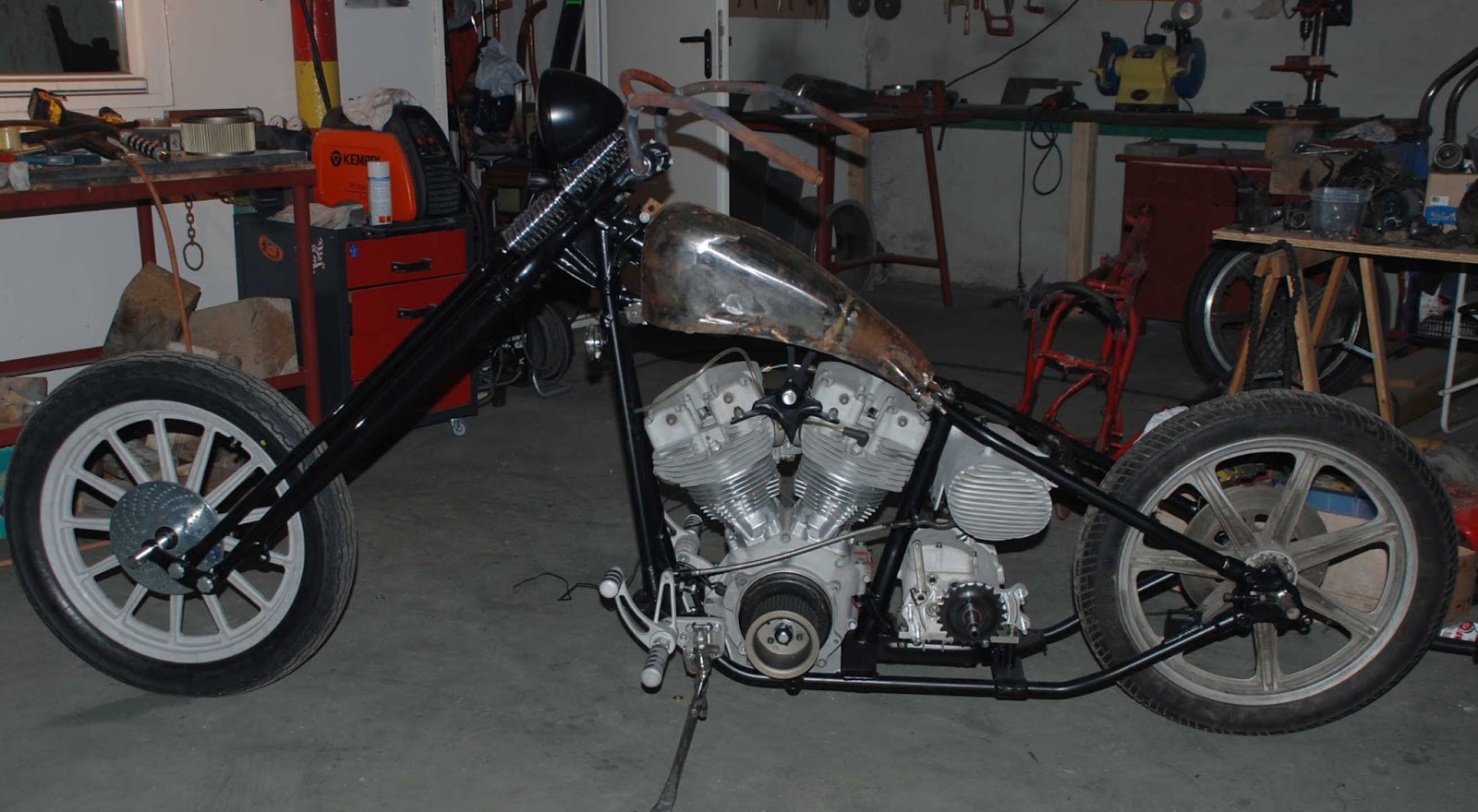Ich habe aber so ein bisschen das Gefühl, dass Du dem Schwedenstil nicht ganz abgeneigt bist. Und wenn Du die Kiste ursprünglich mit Tollegabel und längeren Rohren bauen wolltest, kann es sein, dass Dir ursprünglich ein etwas anderer Stil vorgeschwebt hat? Bei den Schwedenchoppern liegen die Rahmen und auch die untere Linie des Sportstertanks ja häufig parallel zur Straße.