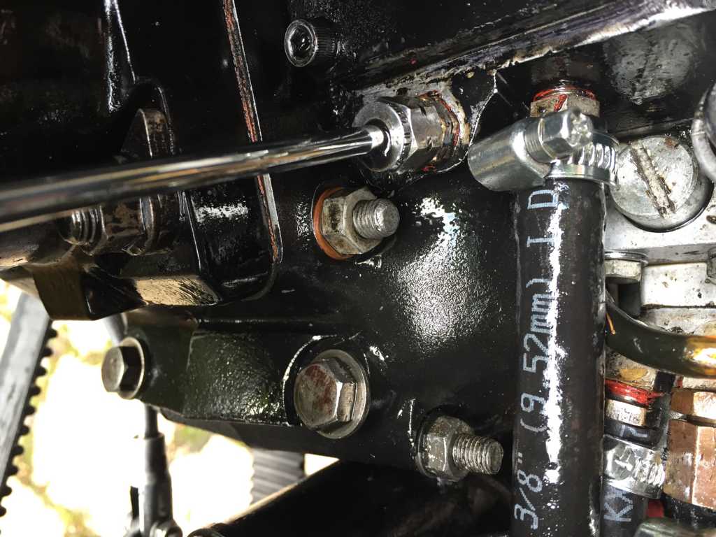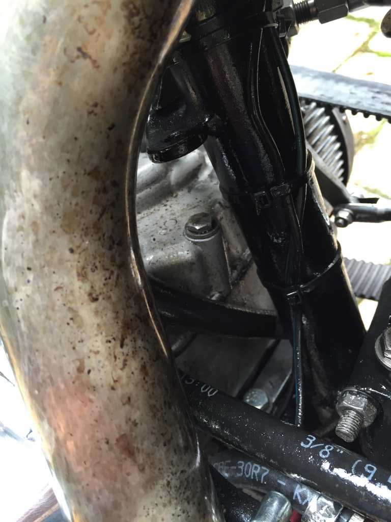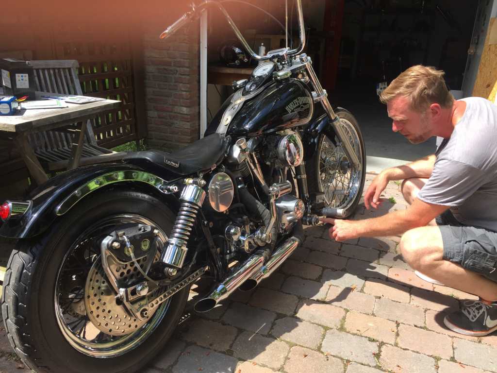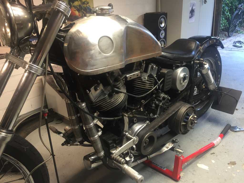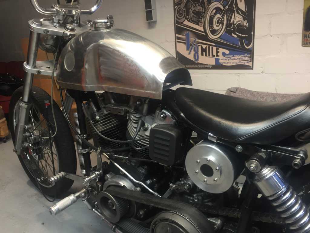 Ich hatte das Standgas von ganz niedrig bis etwas höher komplett ausprobiert. Würde mal behaupten, dass sich da nichts tat. Gerne ging mir die Kiste auch nach einer klassischen Rotphase an der Ampel mit einem Vergaserpatscher aus. Gestern war ich nachdem ich den Tank abgenommen hatte so genervt, dass ich mich dazu entschlossen habe, den Shovel diese Saison nicht weiter zu fahren, sondern so wie auch geplant, ihn komplett auseinander zu nehmen und anders aufzubauen. Beim Entfernen des Tanks hatte ich festgestellt, dass die obere Motorhalterung komplett lose war. Bei der letzten Fahrt hat der Reifen Kontakt mit der Kette aufgenommen. Keine Ahnung wie das passieren konnte. Nach jeder Fahr ist der Motor ziemlich eingeölt. Keine Ahnung wo die undichte Stelle ist. Der Motor soll gemacht worden sein. Rechnungen hierüber habe ich auch. Er springt auch gut an und hat ordentlich Druck. Aber er sift. Die Standgasfrage werde ich dann klären, wenn ich den Hobel wieder zusammen habe. Von der Logik her würde ich auch auf den Versteller tippen. Mit der Luft hätte ich auch selbst mal drauf kommen können. Aber so ist das manchmal. Da sieht man den Wald vor lauter Bäumen nicht. Was mir noch nicht ganz klar ist, ist ein ruppiges Rutschen beim etwas zügigeren anfahren an der Kupplung mit einem kurzen Schleifgeräusch. Ich würde jetzt mal tippen, dass die Kupplung nicht vernünftig eingestellt ist. Anbei noch ein paar Fotos vom Kaufzustand, den Ölaustritt und gestern bei der ersten Suche nach der richtigen Linie. Werde bei dem Umbau noch etliche Fragen haben. Evtl. erstelle ich dafür mal nen Umbaufred.