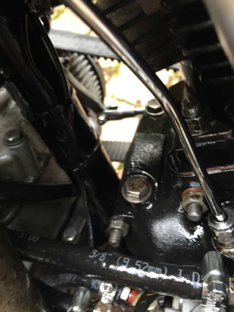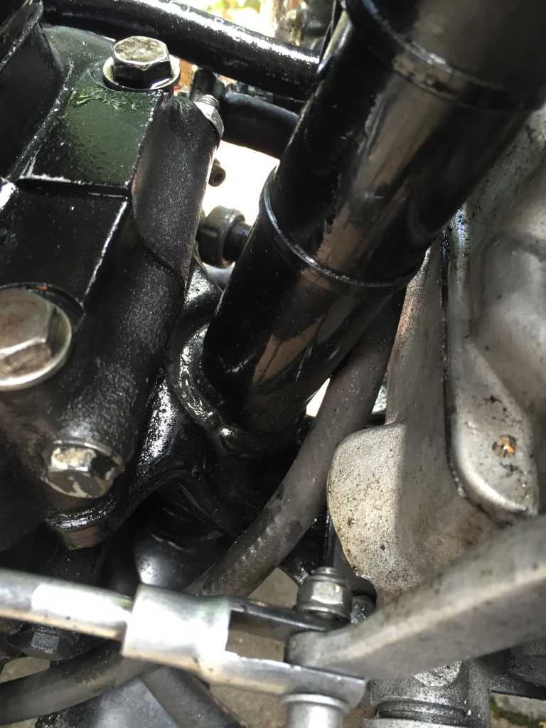 Die Karre springt zumindest im kalten Zustand mit Choke in der Regel beim zweiten Kick an. Wenn sie warm ist, wird´s schwieriger. Da muss ich mich noch rantasten. Ohne Choke hat es bisher nicht geklappt. Voll anfetten, war bisher auch zu viel. Irgendwo in der Mitte wird sicher die Wahrheit liegen. Ganz trocken ist der Bock wie vom Verkäufer angegeben dann doch nicht. Das Domgetriebe war nach jeder Fahrt eingesaut. Da der Block inkl. Zylinder geschwärzt ist, kann man schlecht ausmachen, woher das Öl kommt. Ich denke mal hinterer Zylinderfuss. Kurbelwellensimmerring ist trocken. Etwas Ölnebel an der Steigleitung unten für die Kipphelbelversorgung. Ist das sicher zu vernachlässigen.