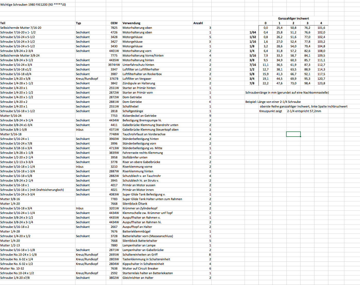 da ich ja gerade mein Project Moped zerlege, habe ich mal angefangen, alle Schrauben und Muttern aufzulisten. Das macht es später beim Zusammenbau deutlich einfacher, da man schneller weiss, welche Grösse und welche Gewindeart wo hinkommt. Die Liste ist natürlich noch nicht komplett, aber man muss ja mal anfangen. In der Tabelle sind die Schraubengrösse, die-länge und die Kopfform notiert. Wenn einen Schraube eine Mutter hat, ist die normalerweise nicht vermerkt, es sei denn es ist was spezielles, ansonsten weiss man ja durch die Gewindegrösse welche Mutter verwendet werden muss. Ich werde die Liste laufend ergänzen, wenn Ihr Interesse habt, kann ich ja dann hier mal gelegentlich ein Update reinstellen. Da mein Moped 100% original werden soll, sind alle Schrauben natürlich nur wie auch im Serienzustand vorhanden. Das Moped ist eine 1980 FXE 1200, da gibt es auch kleine Unterschiede zu den vorherigen und späteren Baujahren. Ich habe mir Mühe gegeben, aber Fehler können natürlich drin sein. Vielleicht hilft es ja dem einen oder anderen.