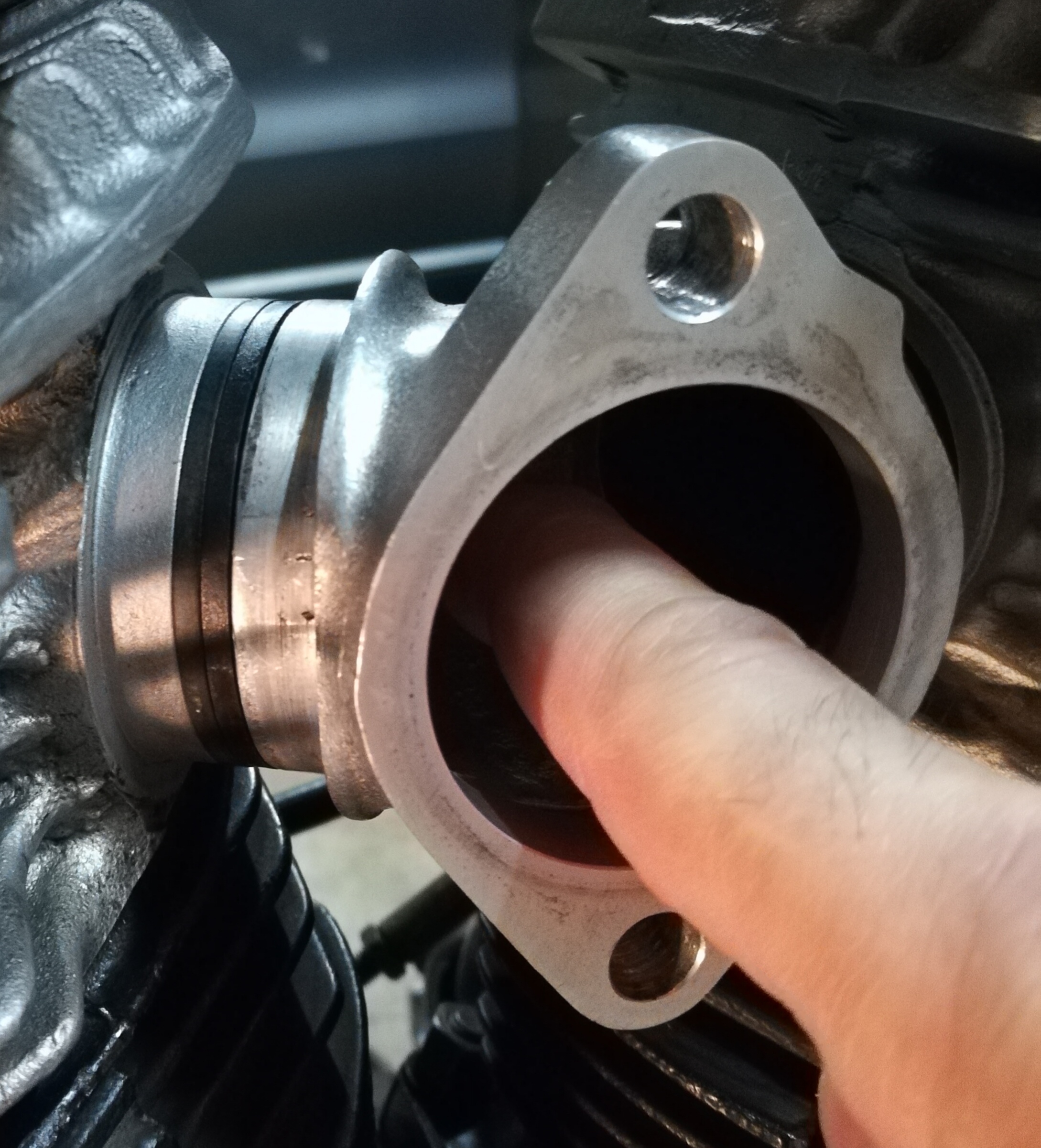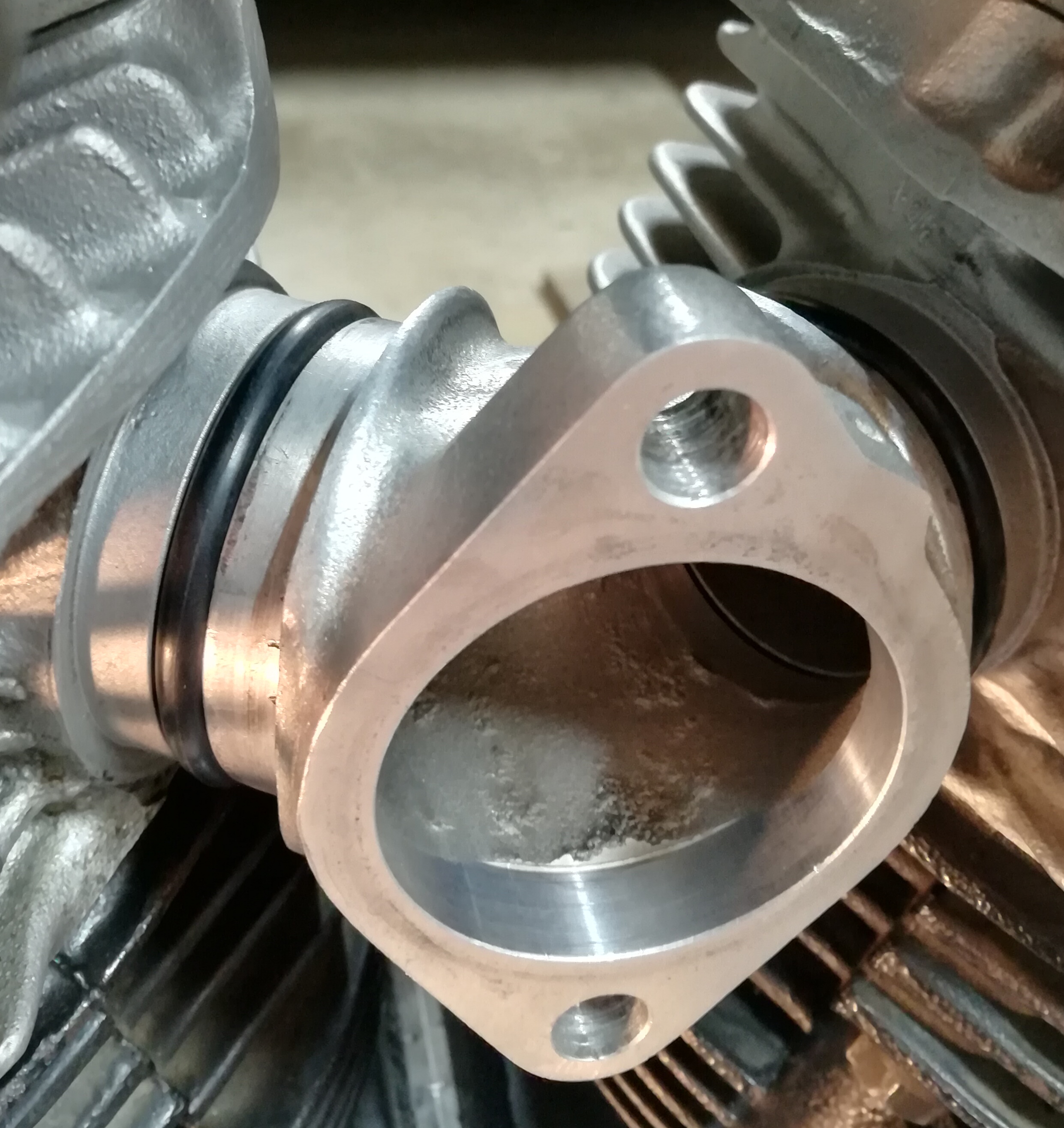 Also habe ich meinen Ansaugtrakt abgebaut. Köpfe waren runter und sind nun mit neuen Dichtungen wieder drauf. Dabei habe ich den Stutzten zu den Köpfen sehr gut ausgerichtet. Eigentlich ist es ein O-Ring Stutzten aber ich hatte da schon immer Rubberbands drauf. Welche von Ron, S&S und was weiß ich. Zusätzlich hatte ich diese Plastikringe montiert, welche an der Stelle von dem O-Ring sitzen.