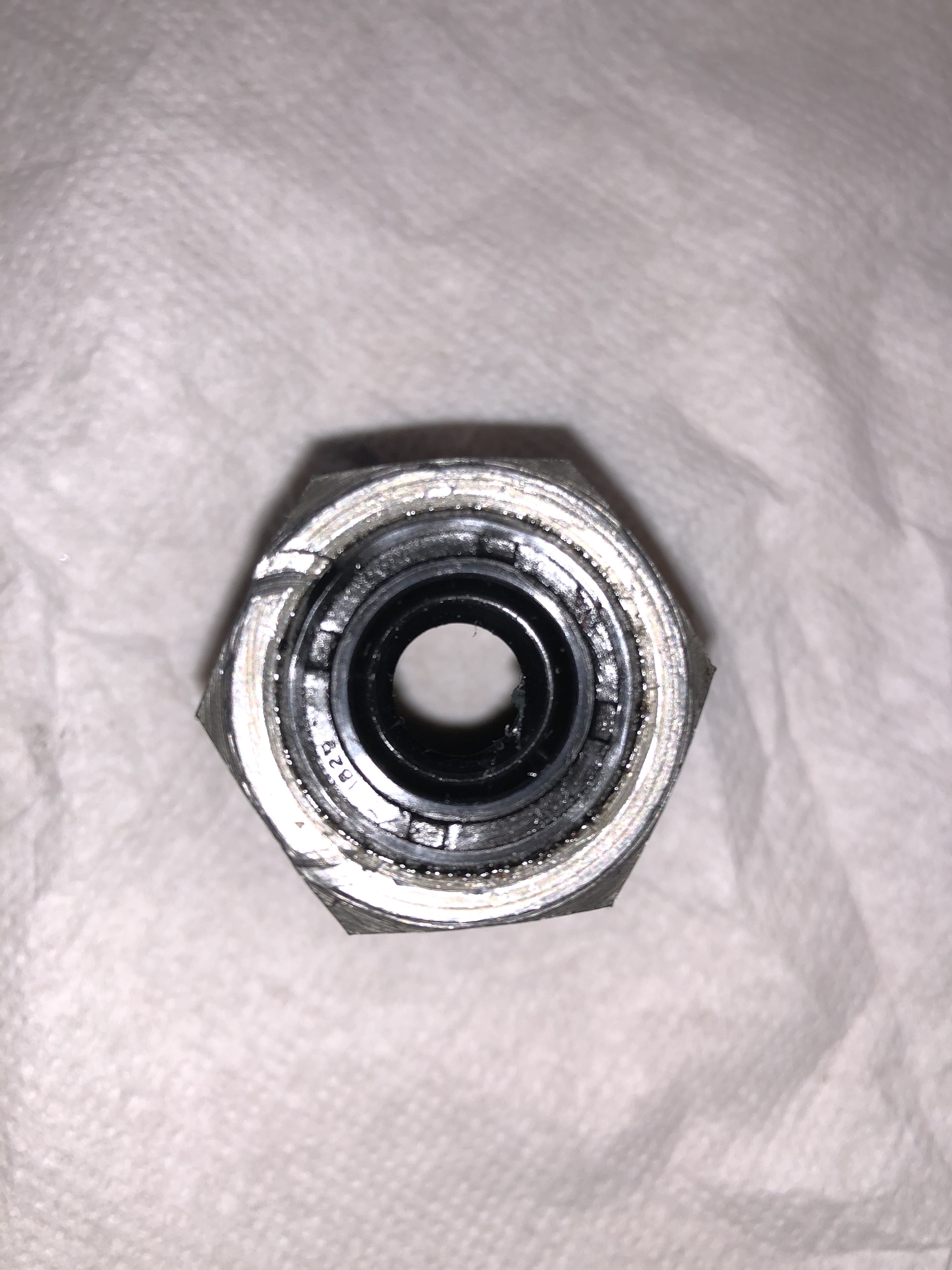 Die eigentliche Frage dreht sich aber um die Mutter mit dem Wellendichtring. Wie bekommt man diesen gut raus und wieder rein?? Das scheint bei mir schon mal einer gemacht zu haben - 2 starke Riefen sind an der Stirnseite der Mutter zu sehen.