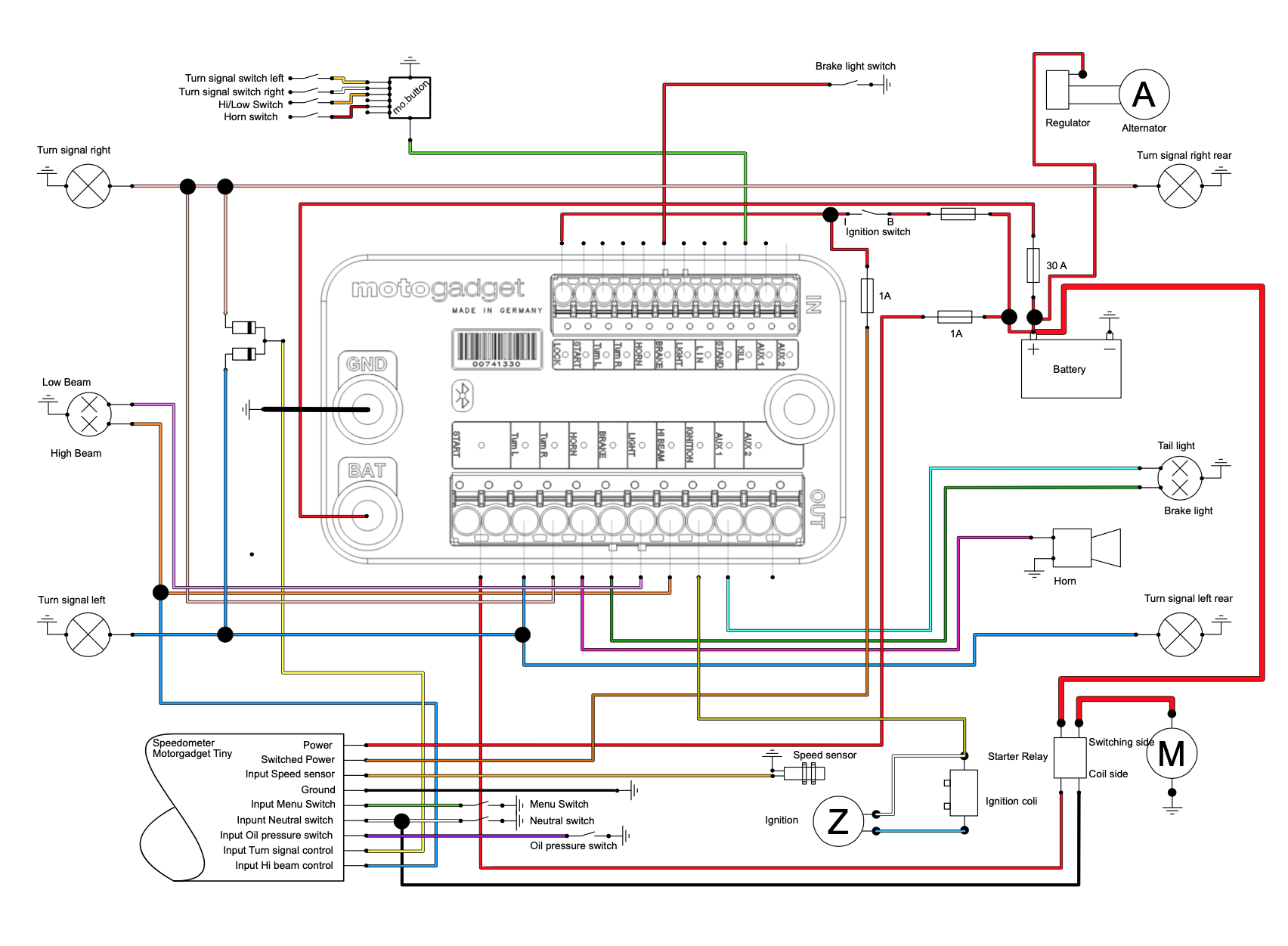 Im Unterschied zu Franz gehe ich aber noch einen Schritt weiter und mache direkt die komplette Elektik neu. Dafür nehme ich ein Motogadget Mo.Unit Modul, den Mo.Button für den Lenker und weil es gerade passt, kommt auch noch ein neuer Tacho und andere Blinker ans Bike.
