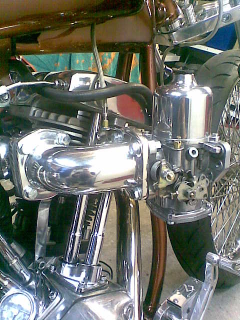 Mit dem kurzen Manifold, der den Vergaser nach unten versetzt, passt der 5 Gal. extrem knapp - Dämpferschraube geht nicht mehr raus, aber da soll ja eh kein Öl rein beim Moppedbetrieb, hab ich mir sagen lassen und es läuft an meinem Motor allerbest, auch wenns brutal am klappern ist im Standgas.