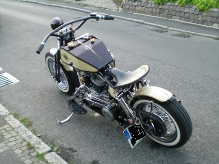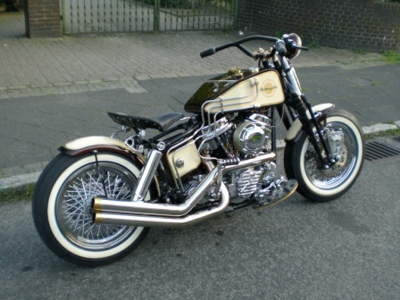 Es ist ein 58er Knickrahmen. Der Motor hat mitlerweile 1600ccm mit STD Köpfen 2Kerzen pro Kopf, S&S super E Vergaser, bis vor kurzem eine Spyke Multisparke Zündung die mir leider geschmolzen ist. Schickes 4 Ganggetriebe mit Fußkupplung und Tankschaltung, 3Zoll offenen Beltantrieb und so weiter. Hab den Ofen selbst aufgebaut.