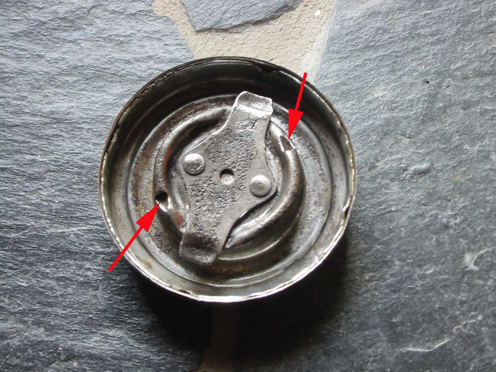 Er hat diese beiden markierten Öffnungen welche untereinander auch verbunden sind. Haben diese eine besondere Funktion eventuell sogar eine Verbindung nach "Außen", vielleicht irgendwie verstopft? Kennt sich jemand mit diesen Deckeln aus?
