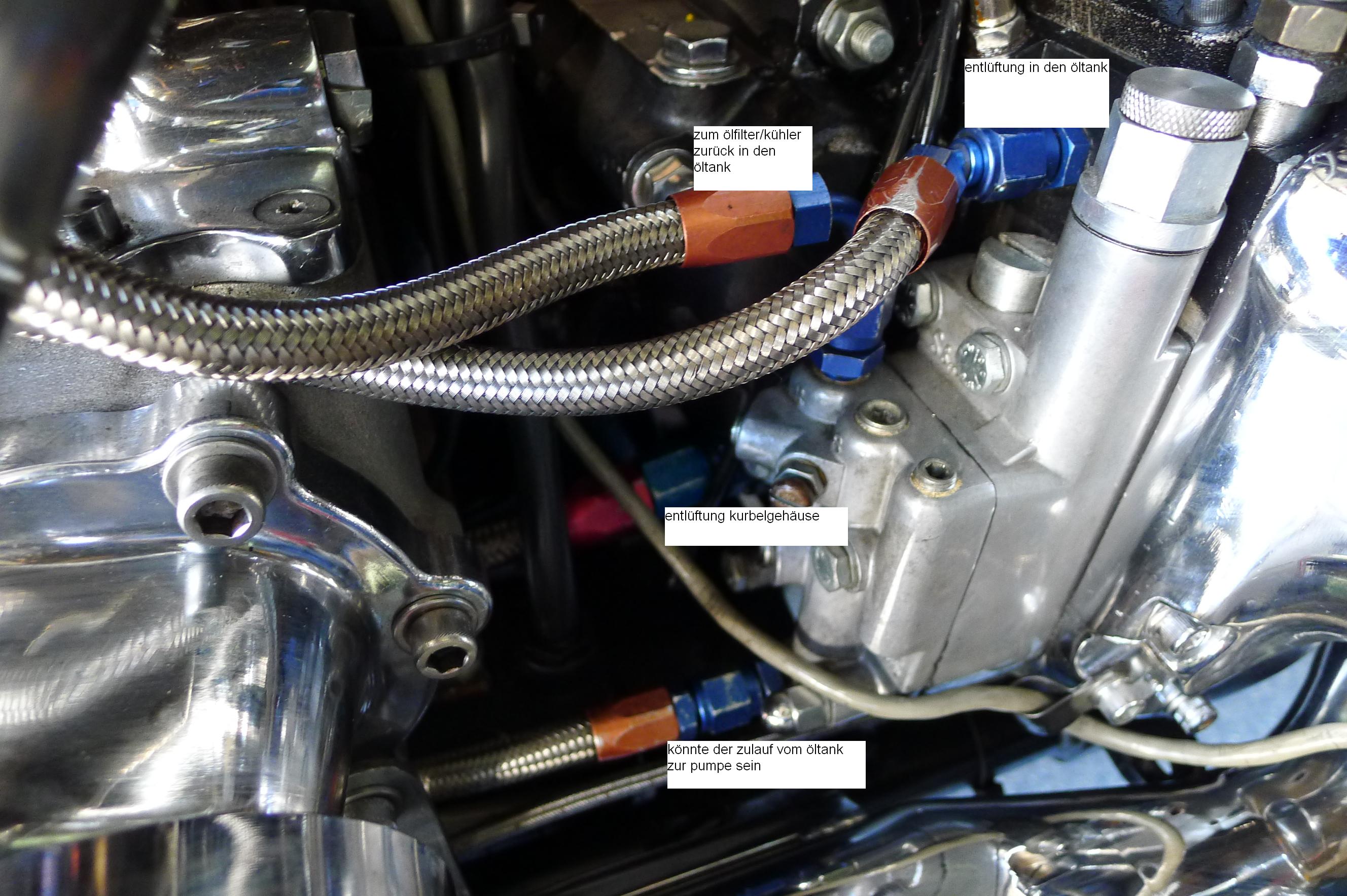 auf shovelschuppen.de findest Du ne PDF mit allen Ölpumpenanschlüssen und wo die hingehören, Deine Anschlüsse sehen auf den Fotos anders aus, bzw. fehlen.............