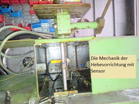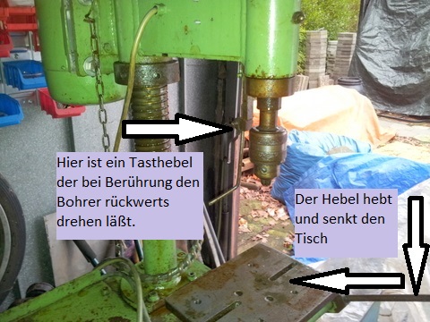 Taster die Tiefe erreicht dreht der Bohrer rückwärts. Der untere Befestigungstisch kann mit einem Hebel angehoben werden.