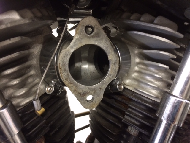 Mein Problem war das der Vorbesitzer den CV zwar wirklich bombensicher angebaut hat mit zwei Streben rechts und links (sieht man auf dem Foto Tankvergaser) an den Zylinderdeckeln und ich wollte die nicht verbiegen bzw. dachte wenn ich die nach unten verbiege ich den Radius der Löcher so verändere das der Vergaser nicht mehr dran passt. Ausserdem bin ich davon ausgegangen das das Manifold so starr (weil aus Guss) ist das ich ich den CV dann nicht mehr sauber drauf gesteckt bekomme.