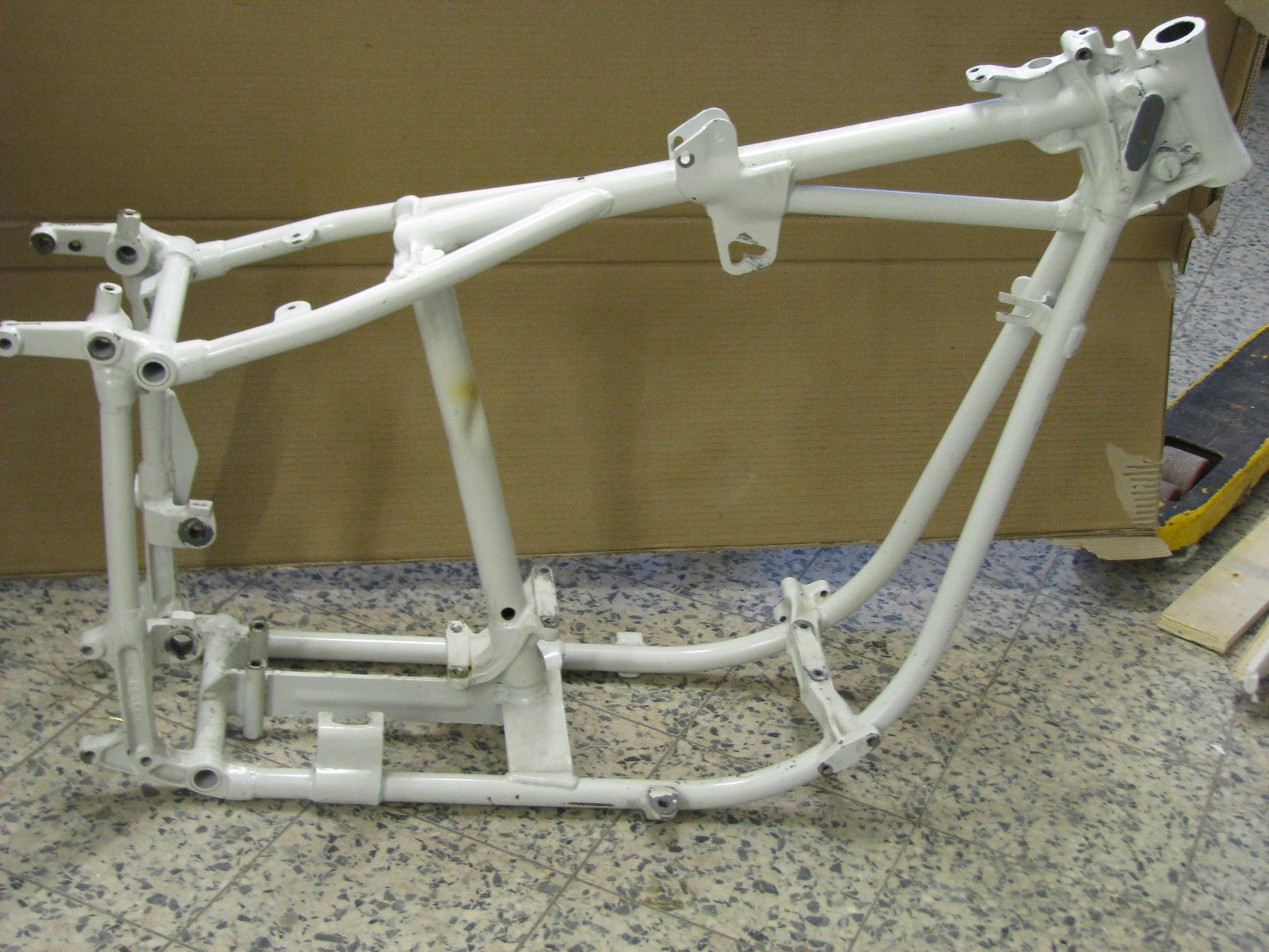 Vergleiche nur mal die Übergänge von den Gussstücken (die mit dem Knick) zu dem Querrohr, oder die bleche für die hinteren tankhalter. Auch die rohre, die von den hinteren gussstücken zu dem Zentralrohr laufen, sehen aus wie Rundrohre, die einfach schräg abgeschnitten wurden. Ich meine, bei den originalrahmen sah der bereich irgendwie breiter (ein bisschen wie flachgeklopft) aus. Hier der link: